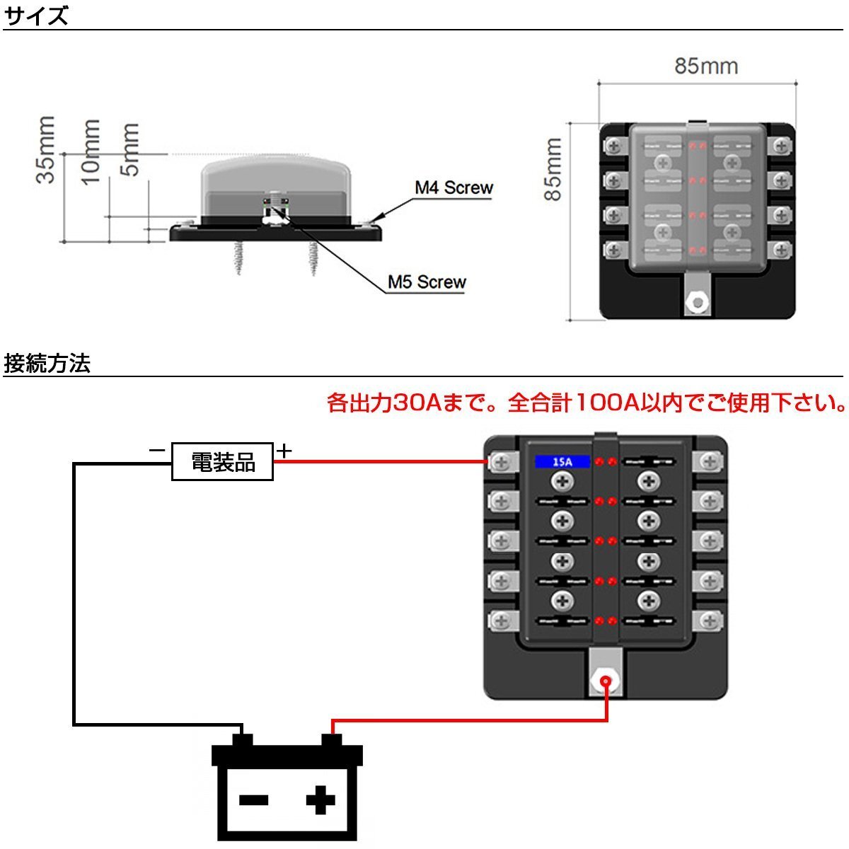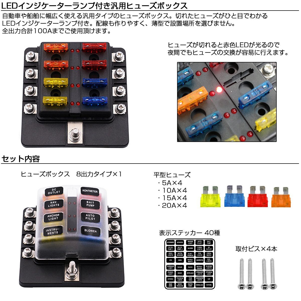 自動車や船舶に幅広く使える汎用タイプのヒューズボックス。 切れたヒューズがひと目でわかるLEDインジケーターランプ付き。 配線も作りやすく、薄型で設置場所を選びません。 1出力最大30A、全出力合計100Aまでご使用頂けます。 | ■ 汎用ヒューズボックス(平型ヒューズタイプ) ■ 動作電圧:DC12-32V ■ 定格:1出力最大30A ※合計100A以内 ■ 出力数:8 ネジ式 ■ 表示ステッカー40種類付き ■ 付属ヒューズ: 5A×4 / 10A×4 / 15A×4 / 20A×4 他のモデルは⇒ こちら | |