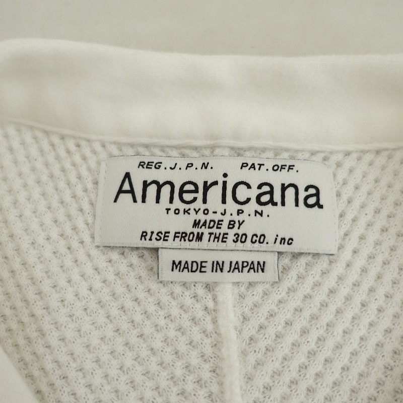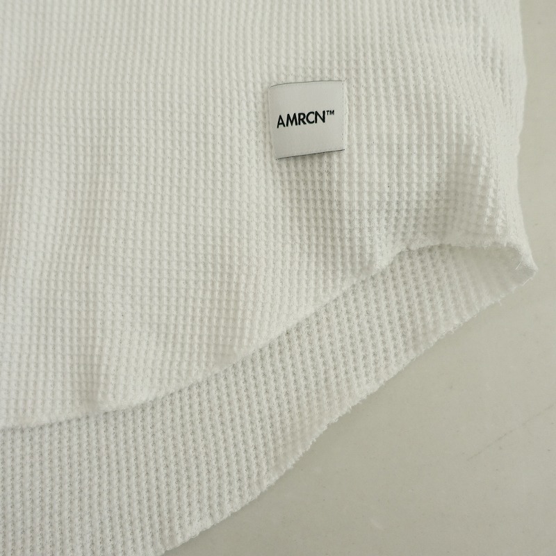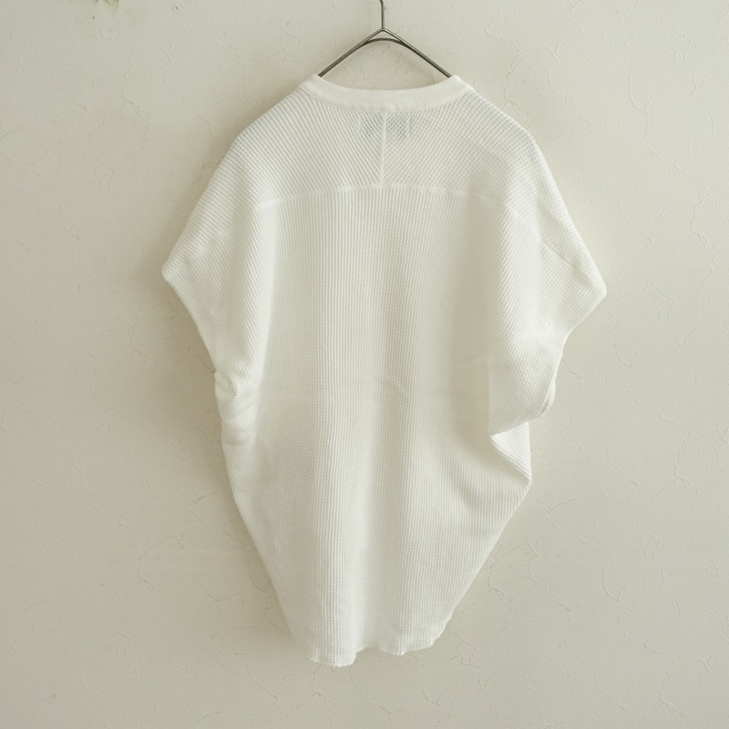 | 2025年春夏コレクション AmericanaのビッグワッフルヘンリーノースリーブTシャツです。カラーはホワイトで、薄手のワッフルニット地です。フロントに半開ボタン付きのプルオーバータイプで着脱でき、襟はリブ仕様で、袖口は上部が内側に折り返されたデザインです。裾はラウンドカット仕様で、裾端はロックミシン仕上げです。定価(メーカー希望小売価格)15,400円の商品です。 |