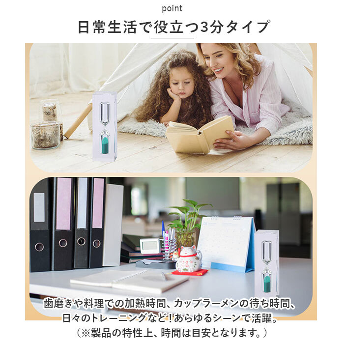 | 商品説明 | ・・手軽に時間を測れる!置いておくだけでインテリアになる砂時計♪ ・【ひっくり返すだけで簡単】 ・スマホやキッチンタイマーなどのデジタル機器と違って、時間を測りたい時に上下にひっくり返すだけ!いざという時にも便利な、設定不要のアナログ構造。 ・【日常生活で役立つ3分タイプ】 ・歯磨きや料理での加熱時間、カップラーメンの待ち時間、日々のトレーニングなど!あらゆるシーンで活躍。(※製品の特性上、時間は目安となります。) ・【コンパクトサイズ】 ・手のひらに乗るサイズ感なので、置き場所に困らず省スペース。旅行などへの持ち運びにも便利。 ・【リラックスタイムのお供に】 ・ぼーっと眺めているだけで、ゆったりとした時間を感じさせてくれる!忙しい毎日の中に癒やしの時間を♪ ・【知育道具としても活躍】 ・歯磨きや朝の準備など・・・お子さまが時間の感覚を身につけるトレーニングにもおすすめ! |