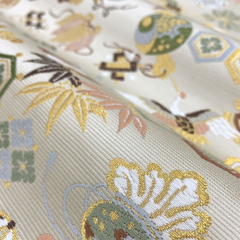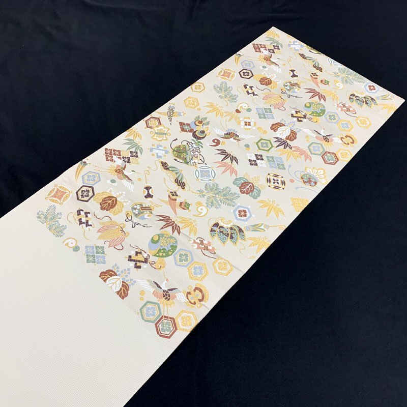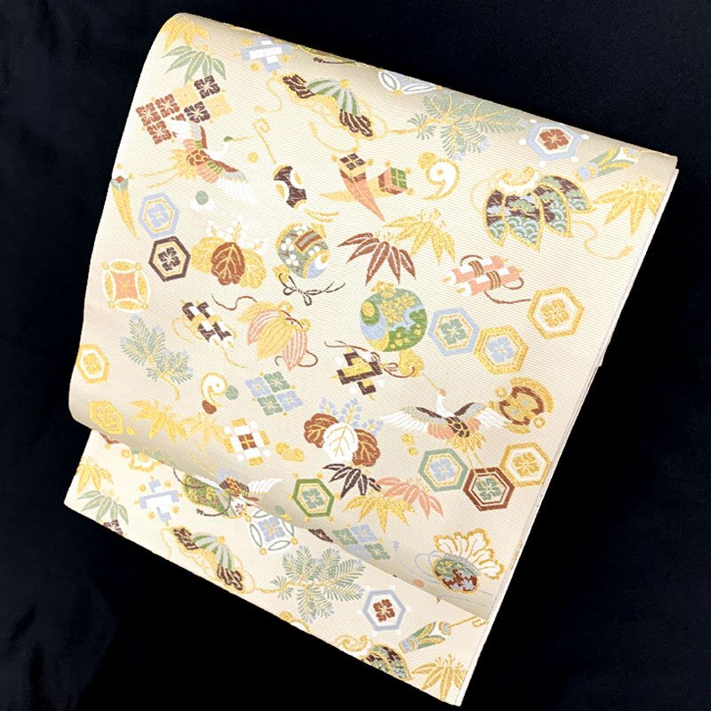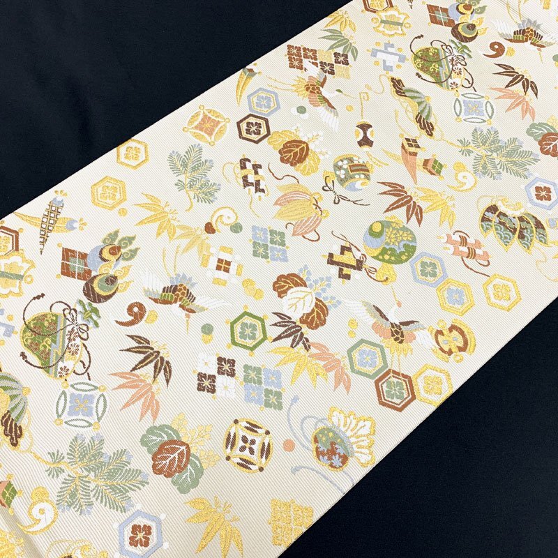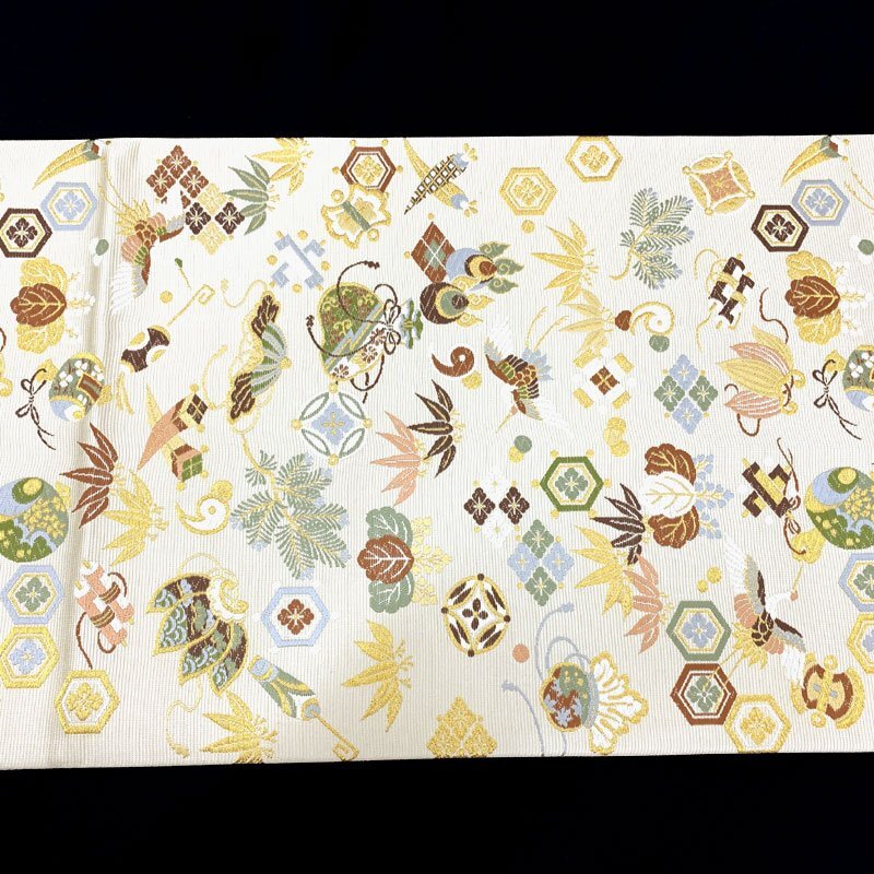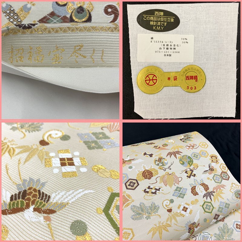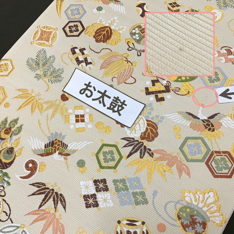 | ◇山下織物 招福宝尽くし 金糸 慶事 お祝い 年始 六通 袋帯◇美品 (No.eed) 西陣織工業組合No.503山下織物謹製の六通袋帯です。打出の小槌や隠れ蓑などの宝尽くし文はもちろん、松竹梅、鶴、桐など吉祥文様が華やかに織り出された逸品! お太鼓上部含め、ごく小さな糸の飛び出しが2.3か所ございます。帯前手前にシミがございます。こちらは場合によっては見える位置にくるかもしれませんが、近くでよく見てわかる程度です。締め跡もほぼ感じられず、大きく気になるようなダメージ等なく美品です。 【素材】絹70%/ポリエステル・レーヨン30% 【色】薄い素色 *モニターによって色味は実際と異なる場合がございます。 【サイズ】幅:31cm、長さ:453cm *素人採寸のため、多少の誤差はご容赦ください。 上質な逸品ですので、いかがでしょうか?よいお品物でお勧めです^^ | |