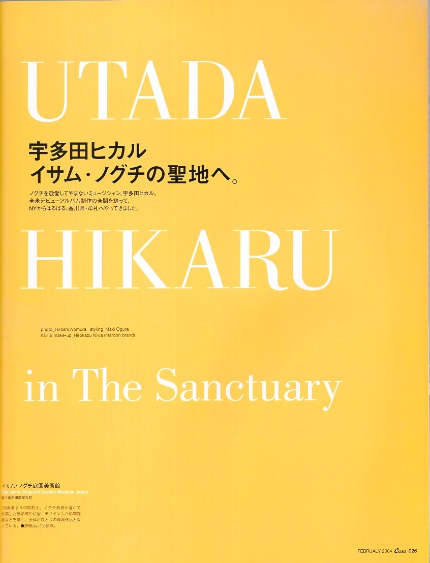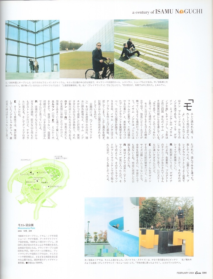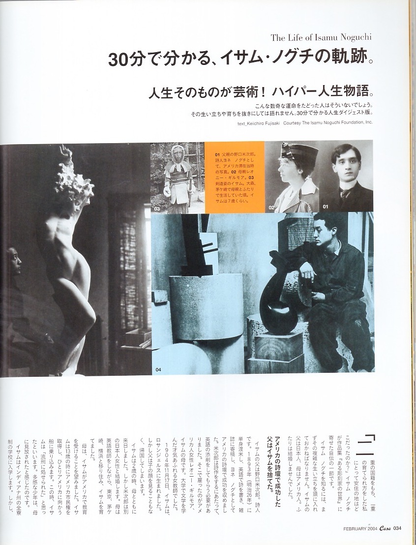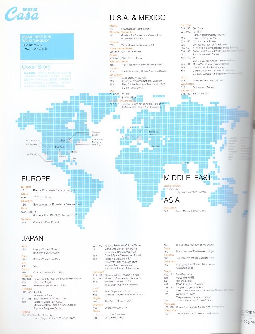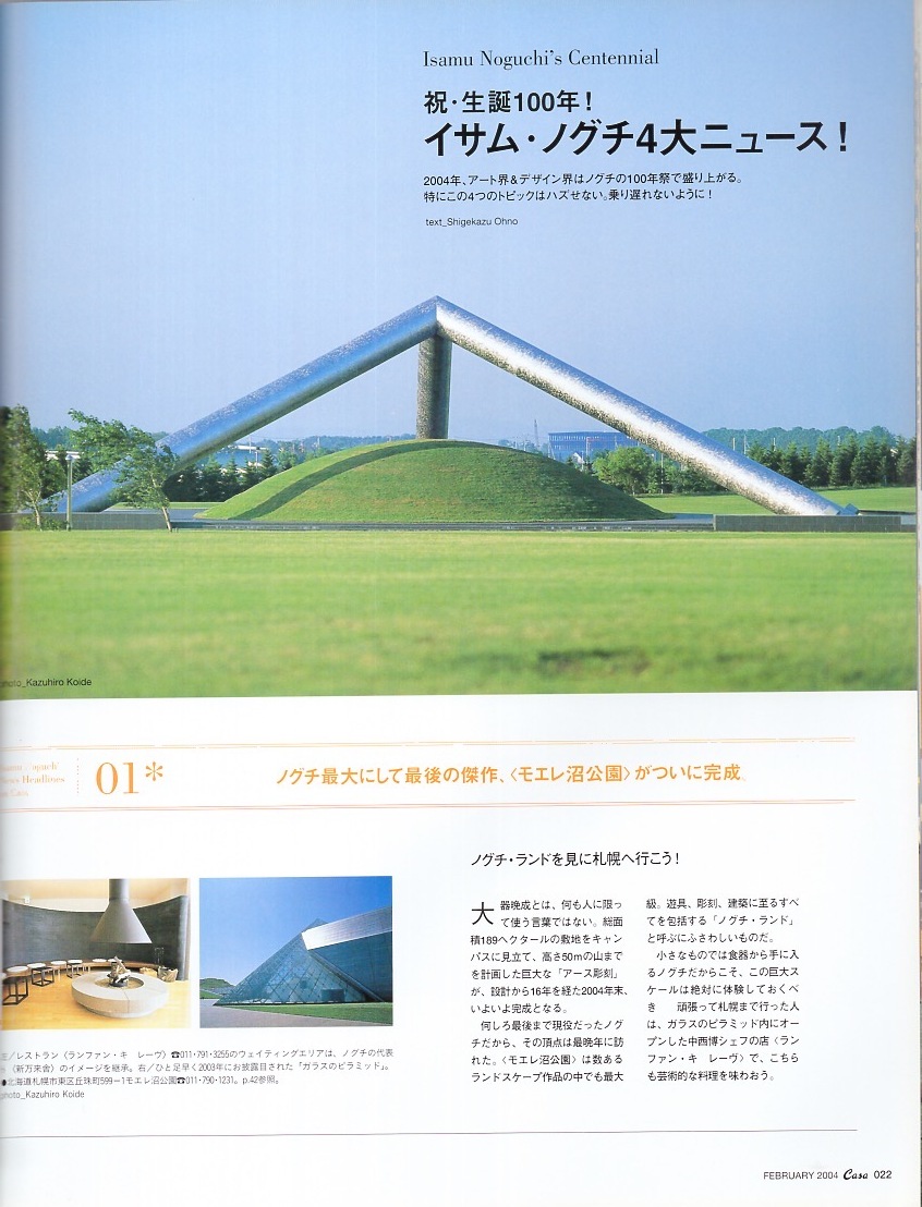 | 生誕100周年記念! アート&デザイン界に今なお輝く イザム・ノグチ伝説。 -------------------------------------------------------------------------------- [Utada Hikaru in the Sanctuary] 宇多田ヒカルと、イサム・ノグチの聖地へ。 今年全米デビューをひかえた日本が誇るディーヴァ、宇多田ヒカル。実は大のノグチ・ファンでした。小さい頃から紙の照明〈あかり〉がある家で育ち、NYではノグチの彫刻の前を毎日歩く生活のヒカルさんが、Casa BRUTUSと一緒に四国の牟礼へ。聖地、〈イサム・ノグチ庭園美術館〉を訪問しました。そこで見た、ノグチ芸術の真髄とは? -------------------------------------------------------------------------------- [Sculptures for Living] あれもこれも、イサム・ノグチです。 テーブルやソファから広大な公園まで、ノグチは私たちが日常生活の中で楽しめる作品をたくさん残してくれました。子供たちが毎日遊ぶ滑り台も「お尻で楽しむ彫刻」なのです。ところで、1970年の大阪万国博覧会にお目見えした、グルグル回ったり水の中に沈んだりする噴水も、イサム・ノグチの作品だって、知ってましたか -------------------------------------------------------------------------------- [Isamu Noguchi's Centennial] 祝・生誕100年! イサム・ノグチ重大ニュース !! 今年2004年の生誕100年を記念して、NYのホイットニー美術館はかつてない規模の回顧展を企画するなど、世界中で様々なエキシビションが準備されています。ノグチが他界する直前に着工した北海道・札幌の〈モエレ沼公園〉も、16年の時を経てついに完成を迎えます。さらにさらに、あの幻の家具〈チェス・テーブル〉も復刻されるらしいですよ! -------------------------------------------------------------------------------- [Living with Isamu] 買えるプロダクト、ほぼ全カタログ。 ミッドセンチュリーにハーマン・ミラーやノールで製作されたソファやテーブル、そしてカトラリーやカップなどなど、〈ヴィトラ・デザイン・ミュージアム〉から続々復刻されているノグチのデザイン。そして、製造元の〈オゼキ〉ですら全てはとても把握できないという〈あかり〉のほぼ全カタログなど。世界で唯一のイサム・ノグチ商品カタログほぼ完全版です! 新たに発売されてた、ブランコなどの遊具まで網羅。 -------------------------------------------------------------------------------- [Why Do You Respect Noguchi ?] 世界のデザイン界が今、ノグチを敬愛する理由。 夜空に輝くガラスの発光体、東京・青山のプラダ・ブティックは、ノグチの〈あかり〉から発想を得てデザインされたって、知ってましたか? イサム・ノグチによる、従来の彫刻という概念をはるかに超えたアイデアは、現在の建築家、デザイナーを刺激し続けています。そんなノグチを敬愛するデザイナーの一人、ジャスパー・モリソンと〈あかり〉の工房見学のために、岐阜へ行ってきました。 -------------------------------------------------------------------------------- [Isamu Noguchi Sites] 祝・生誕100年! さて、ノグチを見に行きますか。 アメリカ、日本、フランス、イタリア、ドイツ、そしてメキシコにも! 生涯、国境や国籍の壁を軽々と飛び越えて活動したノグチは、世界中に作品を残しました。一般公開されている庭園や公園、パブリック・アートやビルの内装デザインなどなど、詳しいアクセスもばっちりのこのガイドをもって、イサム・ノグチ作品を見にでかけましょう! -------------------------------------------------------------------------------- ■The Life of Isamu Noguhi 30分で知ってるつもり!? ドラマチックなノグチの軌跡。 ■Wanna Ride? 2004年、ついに完成する大地の彫刻! ブルレック兄弟と〈モエレ沼公園〉へ。 ■Living with Isamu <あかり>から待望の復刻テーブルまで、 買えるプロダクト、ほぼ全カタログ。 ■Designs by the Sculptor こんなインテリアも残っています。 ■Isamu Noguchi Sites さて、ノグチを見に行きますか。 世界中の60スポットをナビゲーション。 ■ISAMU NOGUCHI and ISSEY MIYAKE-ARIZONA1997 三宅一生によるオマージュ。伝説の競演を再び。 内容は画像②を参照願います。 | |||