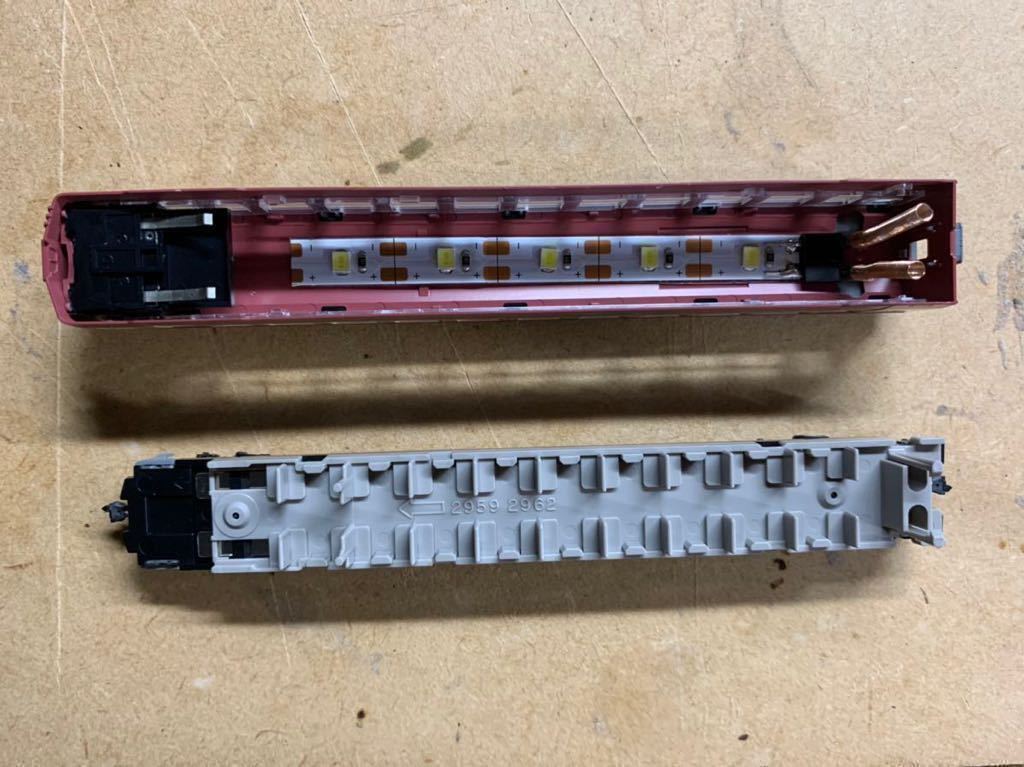 既存のテープLED室内灯を変更、改良し当方の所有車両で動作不良もないことから当オークション向けに製作し出品します。前回品同様に強度を確保するためテープLEDにプラ板を貼り付け3M製強力両面テープを使用していますのでしっかり取り付けられます。1本1本手作りのため数量限定です。なお、点灯確認後出品しておりますが、素人製作のため細かい部分(ハンダ付けなど)はご容赦ください。1本あたりの長さはダイオード(黒色のもの)を含めて約10.8cmです。また1本あたりの消費電力は0.48wです。製品は1本あたり6個のLEDですが、取り付け車両に応じてカット可能となっています。6個LEDは中間車両、5個LEDは先頭車両と使い分けが可能です。長時間点灯(30分以上連続点灯すると、人肌程度の熱を持つ場合があります。模型自体に影響はありませんがご注意ください。)