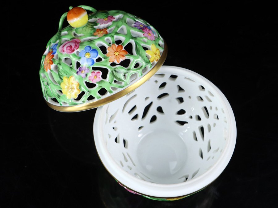 サイズ(約) 高さ 10㎝/直径 9.3㎝/重量 170g 付属品 専用箱 HEREND ヘレンド ファンタジー ボンボニエール ストロベリー 透かし小物入れ 蓋物 箱付 ヘレンドファンタジーボンボニエールでございます。 目立つダメージなく程度良好です。 状態画像でご確認ください。 |