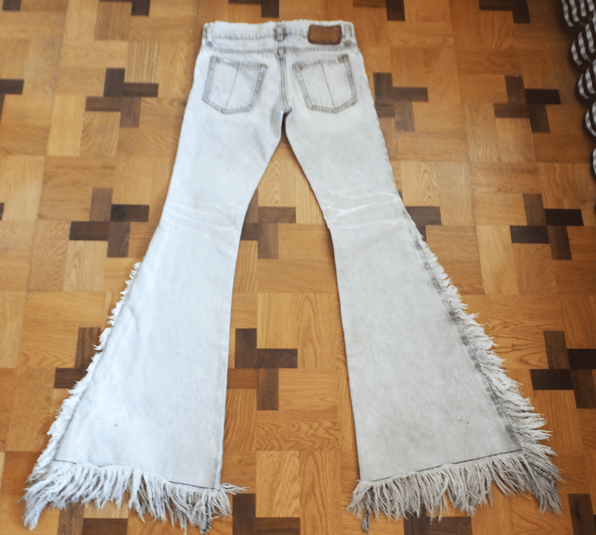 LGBルグランブルーの「BLUE CROW 」ブーツカットデニム。25年程前の初期デザインで希少です。使用も少なく裾上げもしていません。特徴でもあるサイド、裾のフリンジもフワフワなままです。後ろの下の方に小さな黒いシミがあります。お写真でご確認下さい。 数回使用はしてますが、使用感はあまり無い美品と感じます。初期型の為、ウエスト左にシグネチャーのハトメがあります。