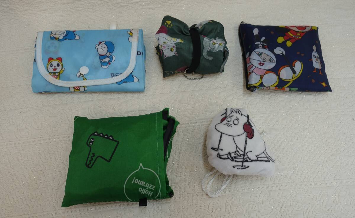 | (M-1048) 折りたたみ エコバッグ トートバッグ ショッピング コンパクトサイズ 5枚セット まとめ売り キャラクター系 可愛い 大容量 中古 | |
