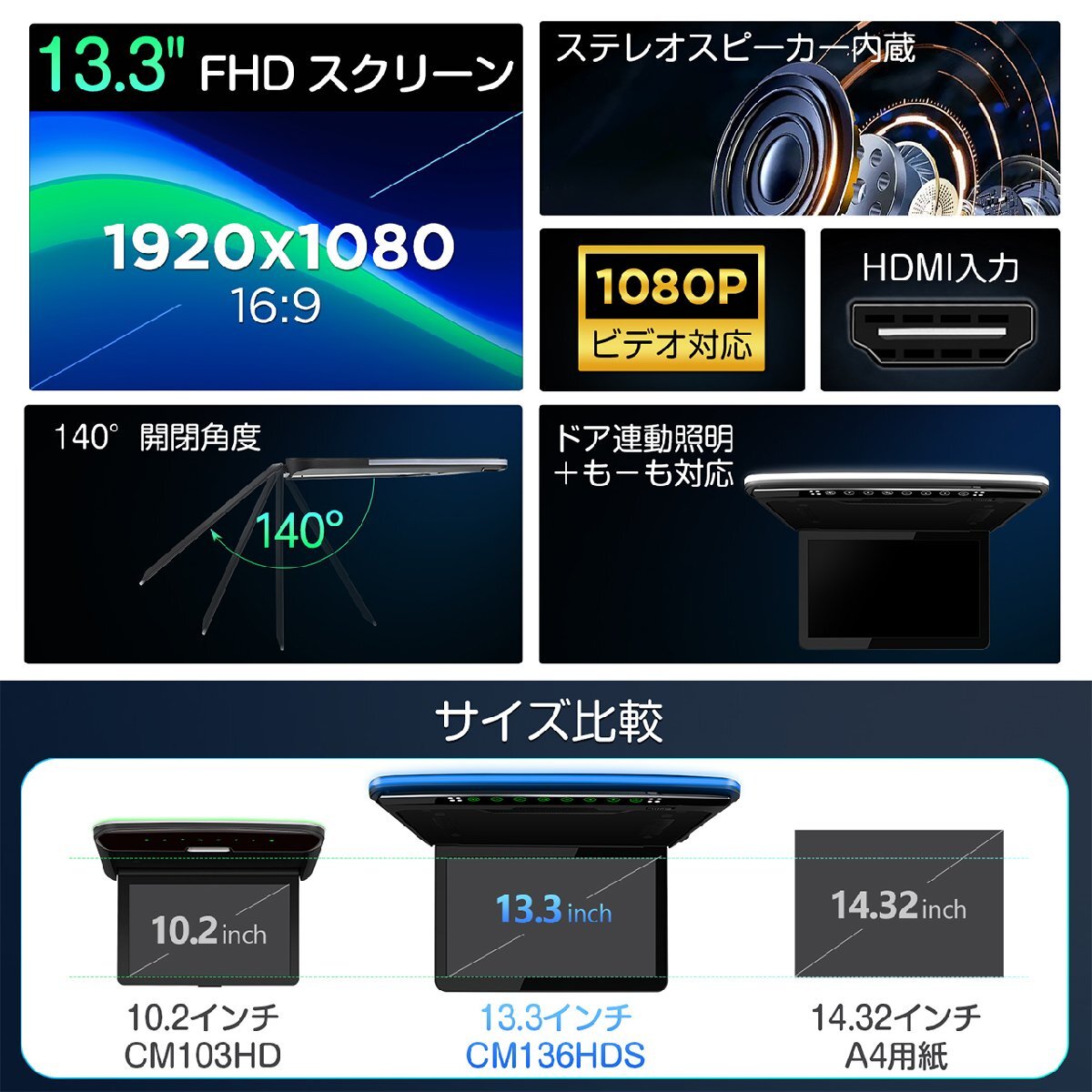 最新販売 スピーカー内蔵 フリップダウン モニター 13.3インチ大画面 1920x1080超高画質 超薄・軽 HDMI対応 ※電源状態記憶機能付 エンジンを切って、再度エンジンをかけると、自動的に電源が入ります。 ※ミラーキャスト搭載&スマホ同期可能 ミラーキャスト搭載で、スマートフォン/タブレットからの写真、 ビデオ、ゲームなど13.3 インチの大画面に同期できます。