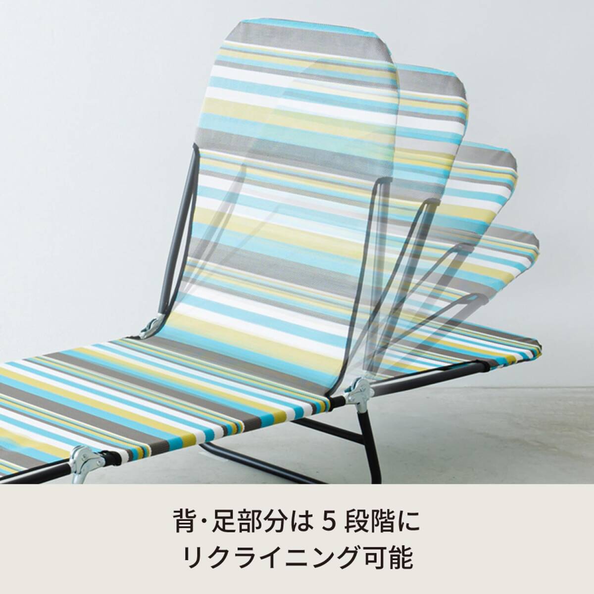 | 商品説明 | ★本体裏面の紐を通す箇所に穴あけ目印がある場合がございます。汚れではありませんのでご了承ください。★本商品は1人用です。 商品サイズ(約):幅57×奥行182×高さ25〜88cm 商品重量(約):4.3kg 耐荷重(約):80kg 素材:テスリン・スチール 塗装:粉体塗装 背側・足側ともに5段階リクライニング可能、脚キャップ付き、完成商品