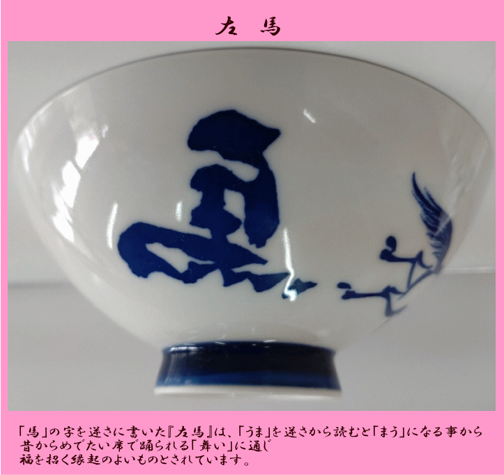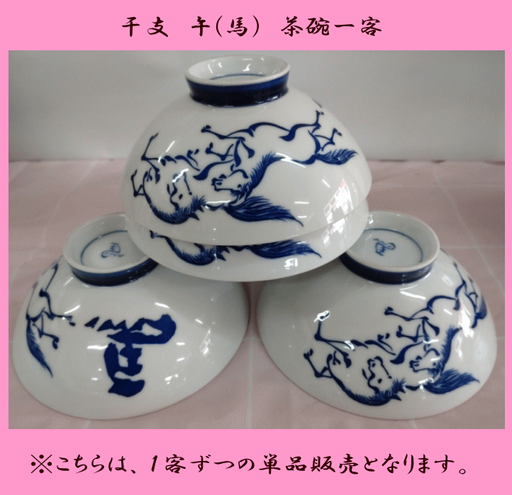 | 2026'の干支であります午(馬・うま)柄の茶碗(1客)です。 馬の文字を逆さまに書いた『左馬』は、「うま」を逆さまに読むと「まう」になることから、 昔からお祝いの席に踊る「舞い」に通じ 福を招く縁起の良いものとされています。 又、『午年』はエネルギッシュで前向きな象徴とされ行動力が高まり 「前進」や「開運」を意味し積極的な挑戦やスピーディーな決断が 成功を引き寄せる年と言われています。 そんな午年(馬)柄の茶碗で毎日の食事を彩り 「幸運を駆け込み全てが馬く(上手く)いく」素敵な年にしましょう!! ★サイズ★ 約11.5×11.5×高さ4.5cm ★素材★ 陶器(美濃焼) ★包装等★ 専属の箱がございませんので、贈答品としてはご対応出来かねます。 家使いの方にお勧めです |