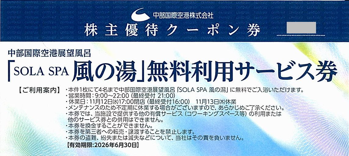有効期限は「2026年6月30日」です。 本件1枚にて4名様まで中部国際空港展望風呂「SOLA SPA 風の湯」に無料でご入浴いただけます。 ※詳細につきましては、画像やホームページの株主優待制度をご覧ください。 |