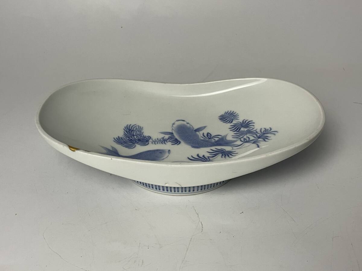 | 鍋島焼 江戸後期 鍋島藩窯 染付金魚文舟形皿 楕円皿 裏絵牡丹唐草文 名品 |