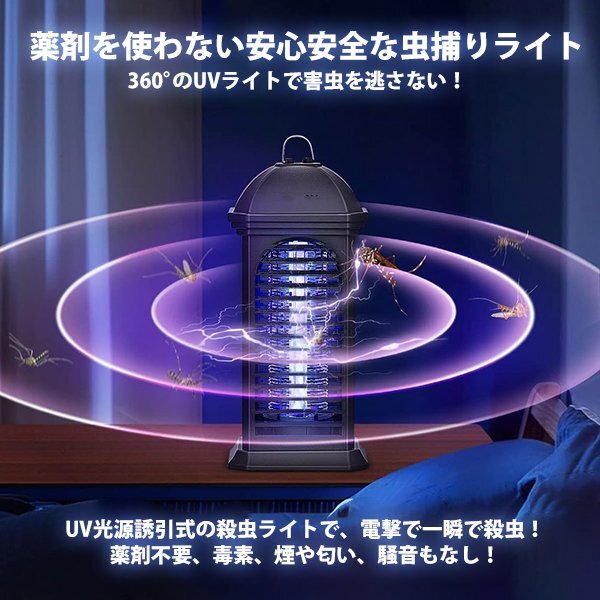 ☆電撃殺虫器 ドーム型 電気蚊取り 【薬剤を使わず・安心安全な虫撃退ライト】 ・ UV光源誘引式の殺虫ライト、電撃で一瞬蚊や蛾などの害虫を駆除します。 ・蚊取り線香より、物理的な方法で薬剤不要、毒素、煙や匂いなどがありません。 ・超静音設計なので様々な所に適用、プロの飲食店でも使われている、本格仕様の電撃殺虫器です。 ・小さなお子様や犬・猫などのペットがいるご家庭でも安心してお使いいただけます。 【操作・設置も簡単】 ・コンセントに挿してスイッチを入れるだけで使えます。 ・吊り下げ式&据え置き式両用設計で殺虫機本体の上部にリングが付いているので、庭に吊り下げも可能、室内据え置きもでき、便利にご使用いただけます。 ※水気のない場所でお使いください。 【省エネ・広範囲・強力電撃殺虫器】 ・補虫蛍光管を内蔵し、360°全方位害虫を誘惑します。 ・大きな音もなく、火発生せず、内部には密集な静電ネット式な設計なので、虫も逃げられません。 ・昼夜を問わずいつでも連続して静音で動作することができます。 キーワード (電撃殺虫器 電気蚊取り 電撃蚊取り器 蚊駆除 害虫 虫取機 LED誘虫灯 超静音 殺虫灯 薬剤不要 モスキートライト ) |