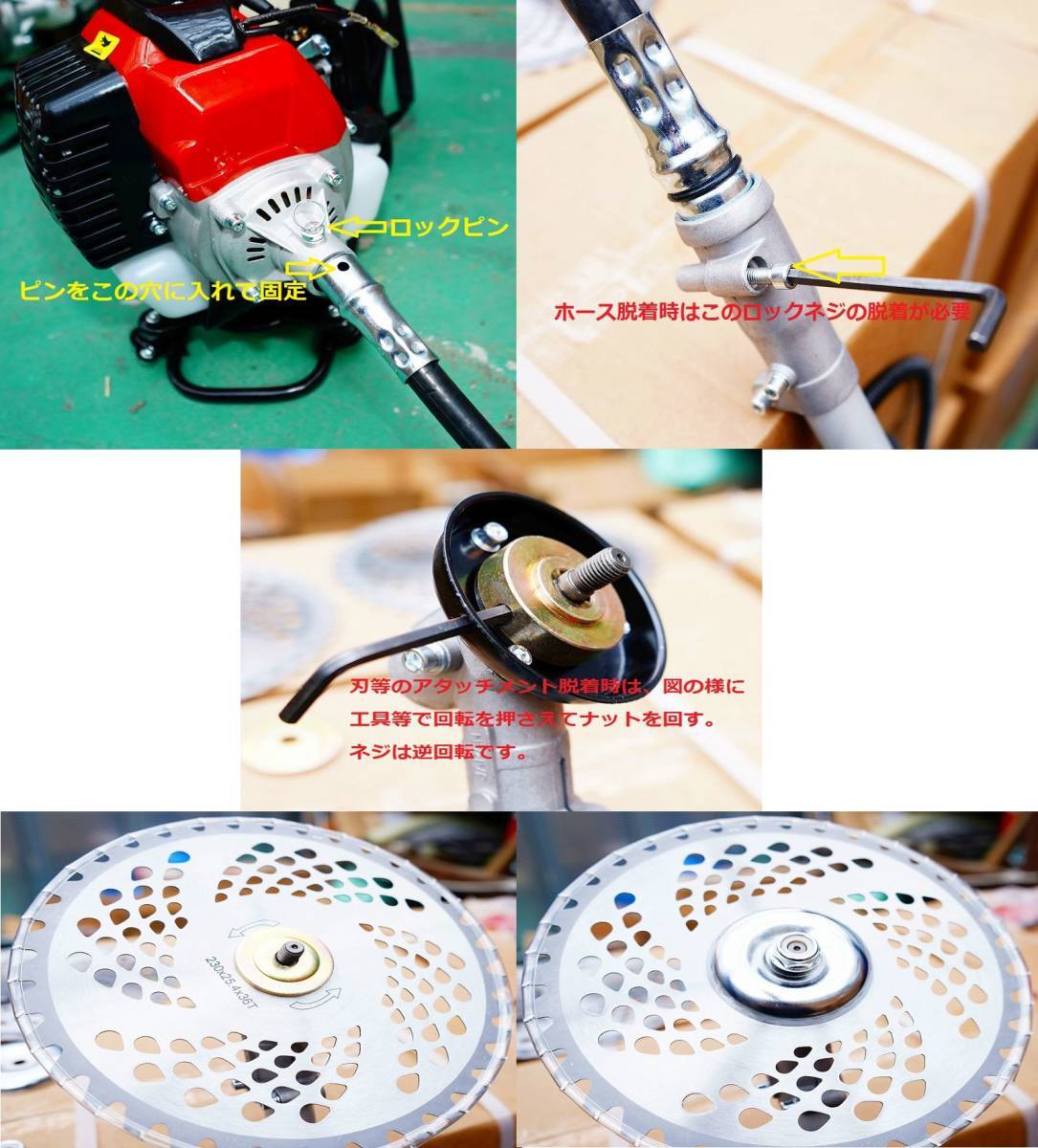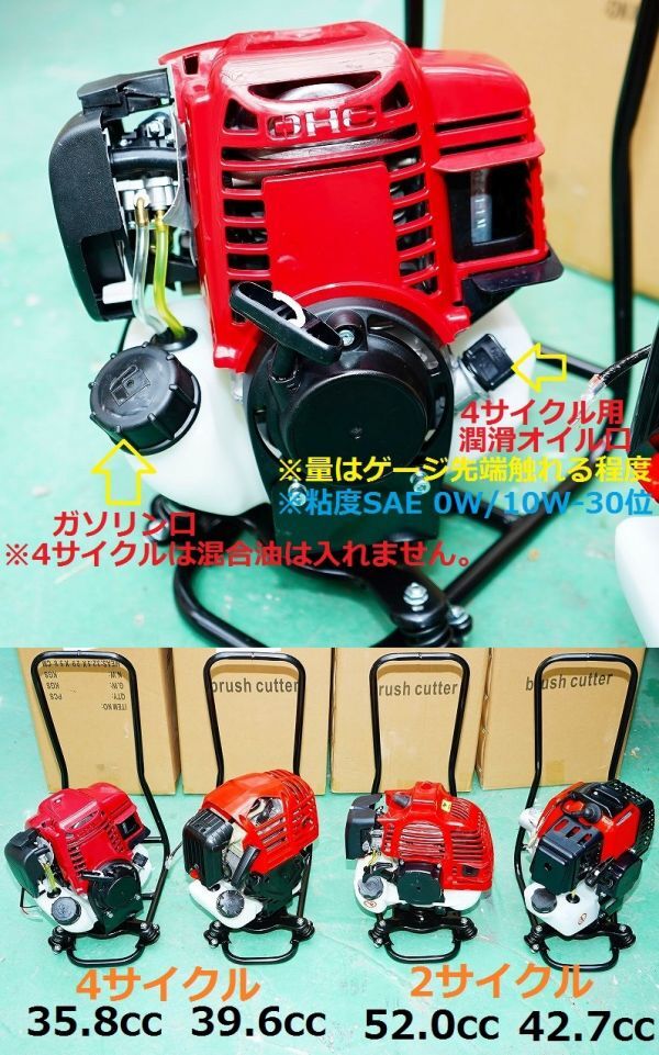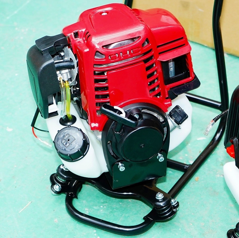 | 商品説明 | エンジン背負い式 草刈機 4サイクル 39.6ccタイプとなります! 特徴 ●エンジン式の強力なパワーで雑草から頑固な笹竹や細木までバリバリ刈れる! ●背負い式草刈機は体に掛かる重量負荷を分散できるので長時間の作業でも疲れにくい! ●肩掛けタイプなどに比べ作業範囲が広くできるので、斜面の上や下など自在に刈れます! ●背当てパッド入りリュックで作業快適! ●リュックに小物入れ部を搭載! ●エンジンの振動吸収をするスプリングマウントを採用! ●グリップ・アクセル操作性に優れた小型レバーを採用! ●2サイクルに比べ静音・静振動な4サイクル39.6cc! ●使用時の騒音が気になる方には4サイクルエンジンがお勧め! 【商品内容】:エンジン背負い式 草刈機 4サイクル 39.6cc 【草刈機タイプ】:背負い式 【エンジンタイプ】:スパークプラグ式4サイクル 【排気量】:39.6cc 【スタート方式】:リコイル式 【使用燃料】:ガソリン(混合油は使いません) 【エンジン潤滑用オイル】:4サイクル専用潤滑オイル 【カラー】:オレンジ・紅赤系 【その他】:丸刃チップソー1枚付属(230×25.4×36Tタイプ) 【重量1】:エンジン部 約5.7kg(パイプ骨格含む、油脂・リュック含まず) 【重量2】:リュック部 約0.8kg 【重量3】:シャフト部 約2.3kg(持ち手・防石カバー含む、先端刃含まず) 【重量4】:フレキホース部 約1.2kg 【重量5】:チップ 約0.3kg(230×25.4×36Tタイプ) ※重量は全て実測値 ○注意事項○ ※使用時やその直後はエンジンが熱くなるので火傷に御注意下さい。 ※使用中はメガネや保護具などを装着し刃の跳ね返りや飛び石に十分注意して下さい。 ※足元が不安定な場所などでのご使用は危ないのでお止め下さい。 ※使用時は不必要にエンジン回転を上げず、適正な回転域で御使用下さい。 (エンジン損傷や火傷防止の為、通常時は概ねアクセルの半開前後域にて使用) ※改造/本来の目的以外/強い衝撃などはお控え下さい。 ※本製品を使用したことによる如何なるトラブル・損害・損失に対して、当方は一切の責任を負いかねますので予め御了承願います。 ※仕様や意匠など改善の為に予告なく変更される場合も御座いますので予め御了承願います。 ※写真は参考一例のため実物とは色味や形状に細かな違いがある場合が御座いますので予め御了承願います。 ※こちらは構成品目が多い為2箱での梱包となります。 ※複数口の荷は運送会社が複数に分かれて分送される場合が御座いますので御了承願います。 ○初期使用時○ ※商品到着時は組み立て前に最初にエンジンの動作確認をして下さい。 エンジンを掛ける手順は1:燃料及びエンジン潤滑用オイルを入れる。2:ポンプを押して燃料をキャブレター内に回す。 3:チョークを開ける(エアクリーナーボックス横の上下レバーをオン側にする(主に下側・この様なlllマーク側)) 4:コイルを勢い良く引いて回す。(通常は5~10回程度引くうちには掛かります) エンジンを掛ける手順は写真説明も参考願います。 ※この段階でエンジンが掛からない場合は、点火系統確認やキャブレター・スロットル微調整等が必要になる場合が御座います。 ※エンジンが掛かるのを確認後は写真を参考にホースやシャフトを組み立てて下さい。 ※工場出荷時にはエンジンを掛けての動作確認がされていますので、内部に少量燃料が残っている場合が御座います。 ※エンジンを切る場合は手元レバーのボタンを長押し(モデルによりオフ側)に操作又はチョークを閉じて下さい。 ※エンジン機構に詳しくない方は、詳しい方にアドバイス等受けてから動作確認・操作等して下さい。 ※個別に操作法や手順を御案内することはこちらでは出来ませんので予め御了承願います。 【その他・御取引詳細に関して】 ◎商品到着後1週間は初期不良の対応をさせて頂きます。 (初期不良の場合は交換又は部品供給の対応を致します。) ◎部品供給の場合は部品輸入等で多少御時間を頂く場合が御座います。 ◎大変恐縮ですが、商品対応は可能ですが交換・供給等に掛かる送料などは御負担をして頂きます。 ◎また通常では考えられない様な使い方や劣悪な環境下での御使用等、製品に起因しない原因での破損等及び加工等されている物などは対象外となります。 ◎初期不良対応は製品に対してだけですので、その他の付随する損害や事故等に関しては当方は一切の責任を負いません。 ◎御取り引き後は返品・返金は基本的に不可になります。 ◎こちらは輸入商品ですので日本製品に比べて仕上げが甘い点や細かな傷・外箱汚損等もあるかと思いますが、その辺りは寛容な御心で御理解を願います。 (使用に障り無い軽度の凹みや傷等はクレーム対応外とさせて頂きます) ◎送料はオークションページ記載の送料となります。 (元払い発送のみで、運送会社指定や日時指定・直接引き取り等は出来ません。) ◎こちらは複数セット御購入の場合、セットごとに送料が掛かります。 ◎落札後は48時間以内にご連絡いただける方で、2~3日内にお支払可