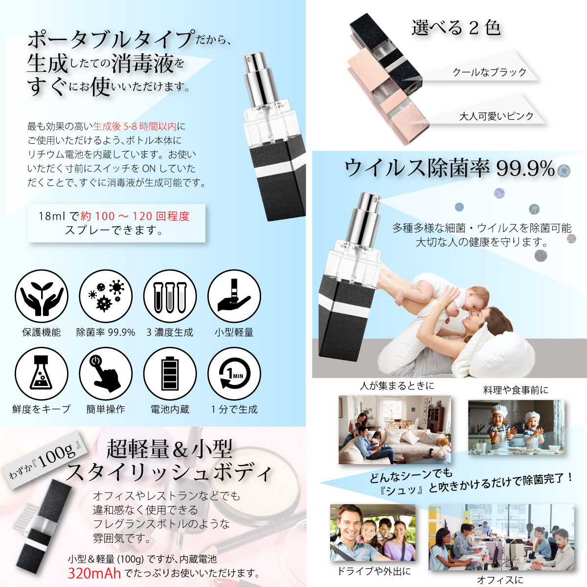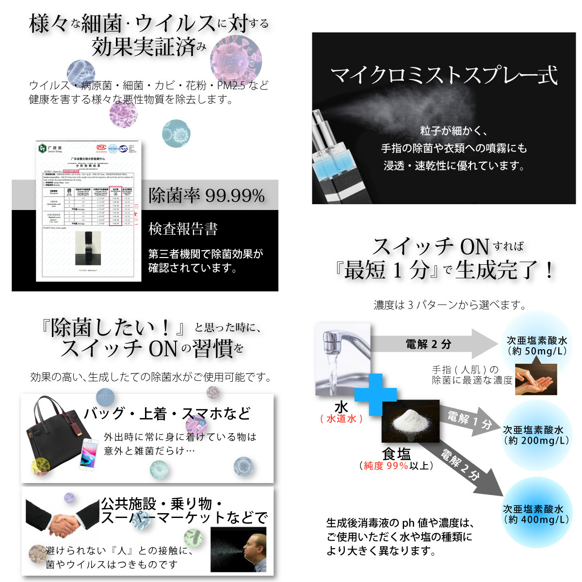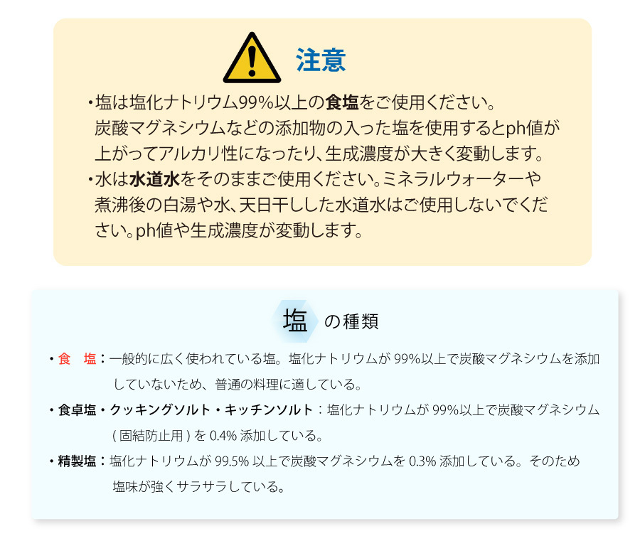 ◆本製品や生成した消毒液はお子様の手の届かない場所で使用・保管してください。 ◆本機は次亜塩素酸ナトリウムではなく『次亜塩素酸水』生成器となります。 ◆水道水の塩素濃度は地域・季節によって変動するので、生成水の濃度も変動します。 ◆火気のそばで使用・保管しないでください。 ◆異常を感じた場合は、速やかにご使用をおやめください。 ◆飲料水ではありませんので、絶対に飲まないでください。 ◆ご使用後は水できれいに洗い流してください。 ◆生成した消毒液は人肌にかかっても問題ありませんが、高濃度生成水は刺激が強いので手の洗浄や直接肌に触れるものには使用しないでください。(人肌にかかっても問題ありませんが、稀に刺激を感じる人もいます) ◆必ず用法・容量を守ってお使いください。 ◆生成した消毒液は時間が経つと効果が薄れます。生成後約5~8時間程度、密封状態であれば7日以内にご使用ください。 ◆生成した消毒液を保管する場合は直射日光のあたらない場所で、遮光ボトルに入れて保管することをお勧めします。 ◆用途に合った濃度の消毒液を生成してください。 ◆噴霧時、材質によってはサビが生じる場合がありますので、予めご了承ください。 ◆塩素臭(濃度やご使用方法により)がする場合がありますので、換気することをお勧めします。 ◆出荷前に検品をしていますので、水が残っている可能性があります。 ◆新品ですが、製造時・輸送時につく小傷がある場合があります。 ◆予告無く商品仕様やデザインが変更される場合があります。 ◆土日祝はすべての業務をお休みさせていただきます。 |