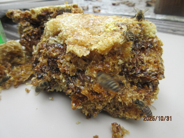 日本ミツバチ分峰捕獲 誘引液作り ミツロウ作り ご自身で作ってみませんか、誘引液は500miペットボトル2~3本位とミツロウがとれます。 鍋に搾りかすを入れて水を1.5~2リットル程入れて火にかけ沸騰してきたら弱火にしてよく溶かし,溶けたら細かい網で濾して冷めるまで、放置しておきます。冷めたら上にミツロウが固まり下に誘引液になります。写真を撮ってる時に画像2の様にミツバチが寄ってきてます。| 出价者 | 信用 | 价格 | 时间 |