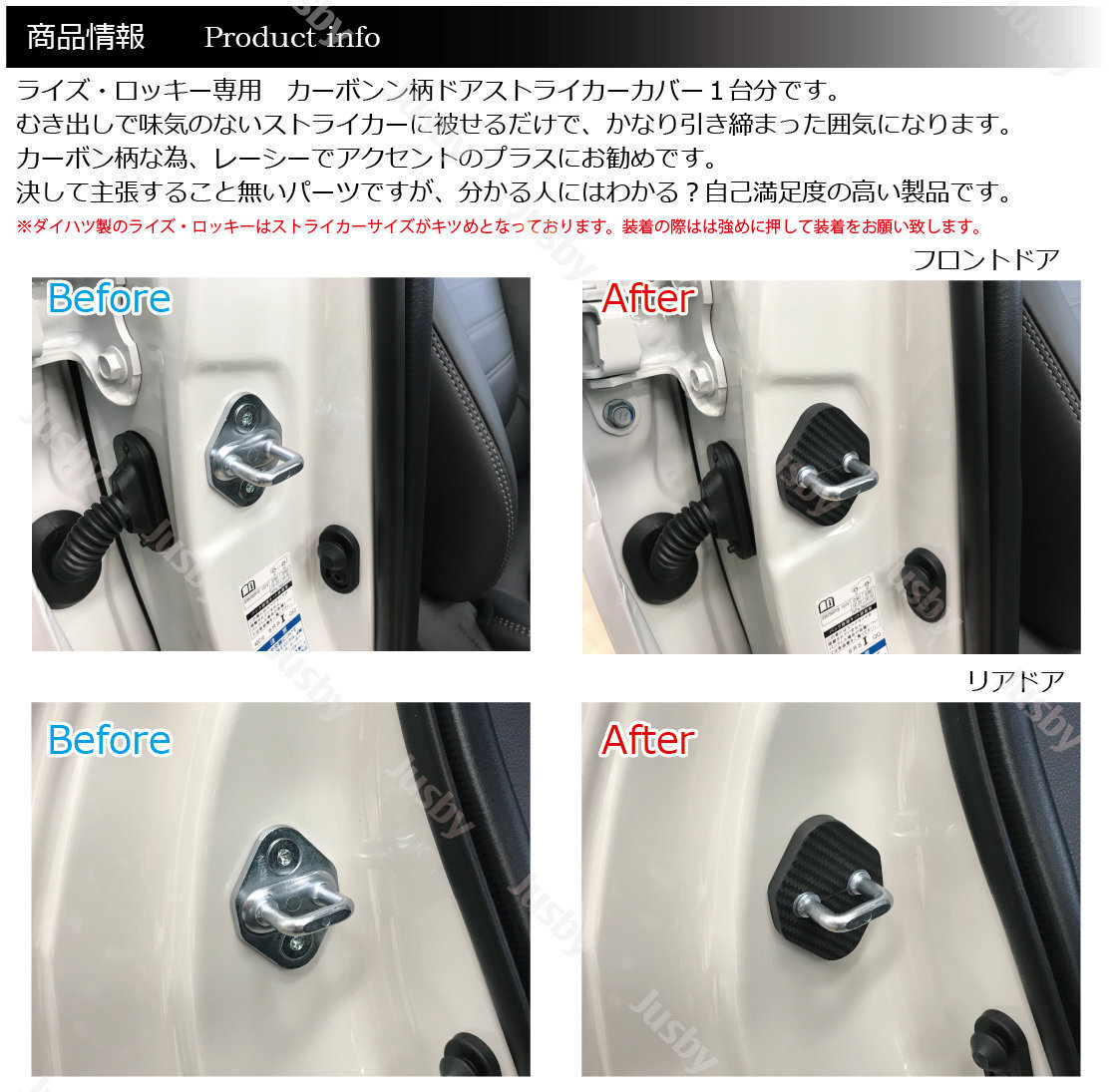 | トヨタ ライズ・ダイハツ・ロッキー専用 カーボン柄タイプ ドアストライカーカバーです カーボン柄のドアカバーはレーシーな雰囲気をプラスしてドレスアップできます。 高級車等に付いているドアストライカーカバーを愛車に装着することによりドア周りが非常に締まった様に見えますのでお薦めです。 ホコリや汚れ、錆等から保護&隠します。(防水性能はありません) ※ダイハツ製 ロッキー・ライズ共に、装着は通常より硬い(キツイ)場合が多いですが仕様となっております。 少し強めに押し付けて装着をお願い致します。 当社オリジナルとなっており他社の様な中国語やロゴ等の印はありませんので純正ルックに装着できます。 商品には無期限のJusby品質保証書を付属しております。装着時・使用時の割れ等を保証対応いたします。 ( ・∀・)Φスタッフレビュー むき出しで味気のないドアストライカーに被せるだけで、かなり大人な雰囲気になります。 決して主張すること無いパーツですが、分かる人にはわかる?自己満足度の高い製品です。 |