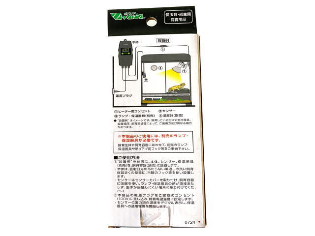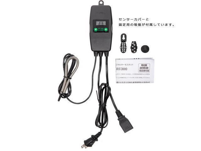 | 商品名:ビバサーモ RT300 爬虫類・両生類用電子制御式デジタルサーモスタット ペットがかじったりしないための安全対策に金属製の コードカバーやセンサーカバー付属 異常温度(高温・低温)、センサー異常(短絡・断線)、 ヒューズ切れを感知した場合、デジタル表示でお知らせします。 ■内容量 本体 1個 センサーカバー 1個 センサー固定用吸盤 1個 金属製センサーコードカバー 1個 (約20cmセンサーコートに組込み) ■商品仕様 定格電圧:AC100V 50/60Hz 最大容量:適用ランプ・保温器具300W 制御温度範囲:約15~45℃(温度設定誤差±1℃) 使用可能周囲温度範囲:約5~35℃ 使用可能周囲湿度範囲:約10~85%(結露なき事) 異常感知シグナル:センサー異常、異常温度(設定温度±5℃)、ヒューズ切れ 原産国:中国 ■商品サイズ 本体(吊り下げフック含まず):幅5.6x奥行2.4x高さ11.5cm 電源コード:1.2m センサーコード:1.4m 保温器具用コンセントコード:0.2m ■注意点 本品の使用には別売りのランプ、保温器具が必要です。別途お買い求め下さい。 水中・屋外・多湿な場所では使用できません。またケージ内での使用もできません。 |