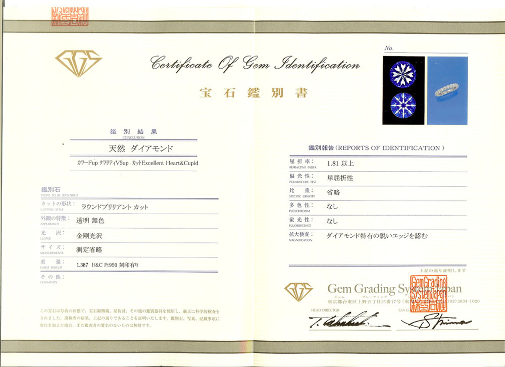 | ダイヤグレード | カラー:Fup クラリティ:VSup カット:EX H&C | |||