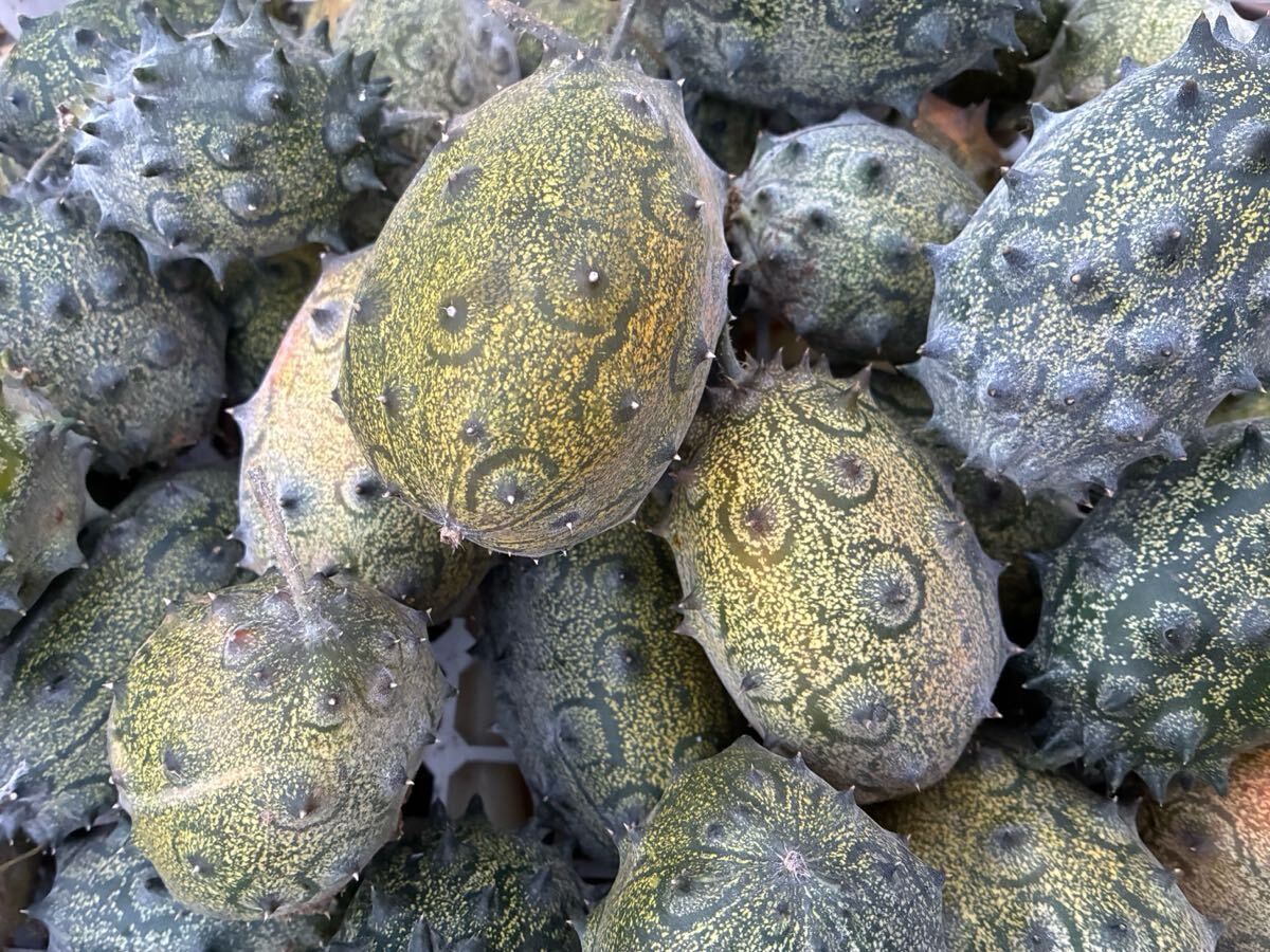 まだあまり知られていませんがトロピカルフルーツのキワノです。黄色く色付くと食べ頃です。半分に割って蜂蜜やミルクをかけて食べてください。タネはプチプチとしていますが食べてしまっても大丈夫です。来年のために種子として取っておくのも一つの方法です。グリーンカーテンとして窓の外に植えると日除けの役割を果たしてくれます。