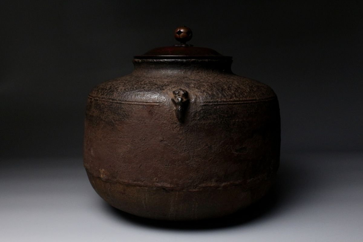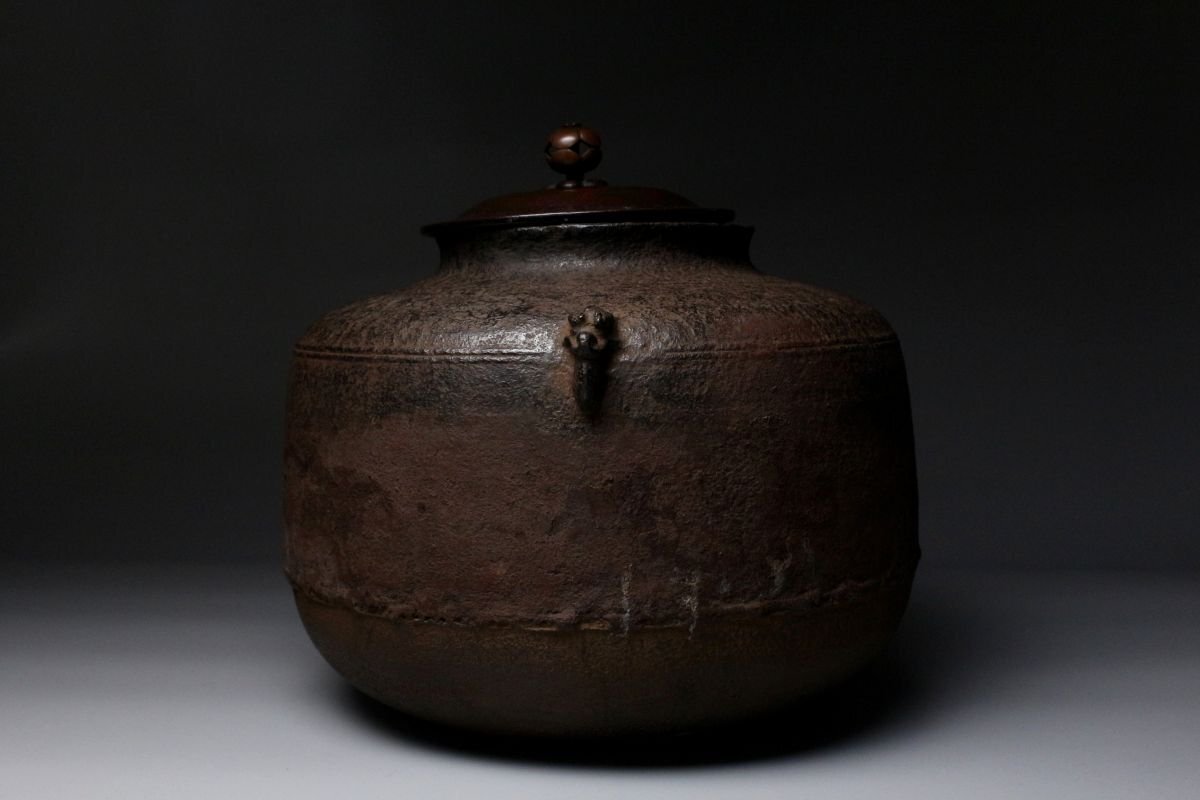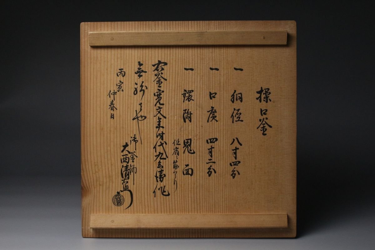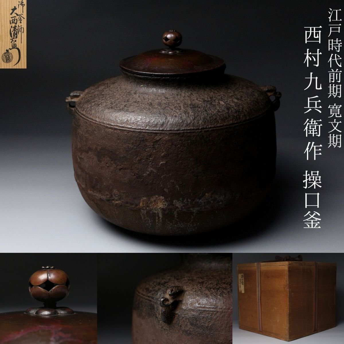 [.O]25.11 251106F09T* * * 商品詳細 * * * ここでしか出逢うことのできない唯一の美をご紹介させて頂きます。 作家略歴 西村九兵衛(にしむら くへえ) 江戸初期の釜師 名:家久 西村九兵衛は、江戸初期に活躍した著名な釜師で、千宗旦(1578~1658)の釜師として知られます。 その出自については諸説あり、西村道仁の子、または孫・弟子とも伝えられ、西村道弥の親類であったともいわれますが、詳細は明らかではありません。 幼少期に父と別れたため、後に名越浄味に師事し、その技を磨いたと伝わります。宗旦好みの「蒲団釜」をはじめ、「四方釜」「裏釜」「累座釜」「唐犬釜」「土斎釜」など、茶の湯にふさわしい多くの名作を残しました。 その作風は、端正な作行と柔らかな線の美しさに特徴があり、地肌は砂肌で中荒肌に近いものが多いながらも、仕上げが極めて巧緻なため荒れが見えず、焼抜を施さない“生釜”でありながら、焼抜以上の精妙な仕上がりを誇ると評されています。 寛文七年(1667)銘のある梵鐘が京都・立本寺に現存し、その優れた技術の高さを伝えています。 子はなかったとされ、一代限りともいわれますが、後世には宝暦年間(1751~1763)に西村九右衛門という釜師が現れ、その子が再び「九兵衛」を称して安永年間(1772~1781)に京都油小路で茶湯釜を制作。これを初代九兵衛の流れを継ぐものとし、以後三代にわたり「久兵衛」を名乗ったと伝えられます。 ■商品内容/ 釜、書付箱 ■サイズ/横26㎝×高23.5㎝ 重量:5kg 箱:四方29㎝×高27㎝ ■状態/ 経年によるスレ、傷、汚れ、錆び、剥がれ 箱にスレ、傷、汚れ、底に割れがございます。 ※水漏れはございません。 ※写真にてご確認、ご了承の上ご入札下さい。