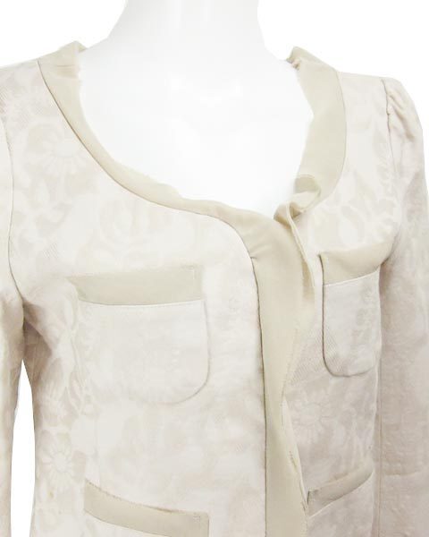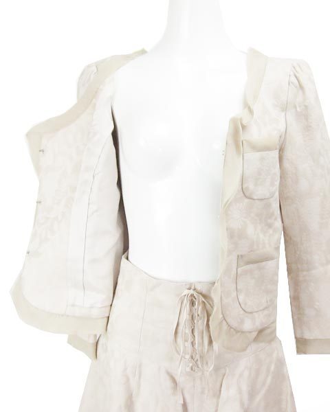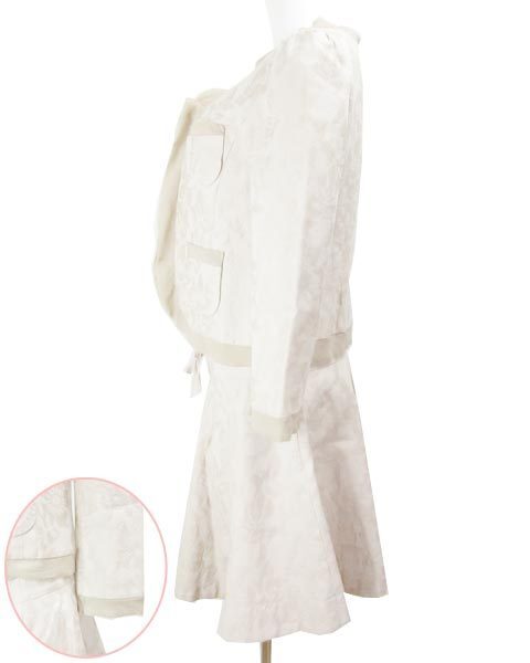 | ノーカラージャケットとフレアスカートのセット。控えめながら存在感のある花柄の地模様とシフォン使いが、上品なベージュに華やかさを添えてくれます。アウトポケットデザインが可愛いコンパクトなジャケットと、ウエストのレースアップがトレンド感たっぷりなスカート、それぞれ単品でも活躍してくれます♪ |