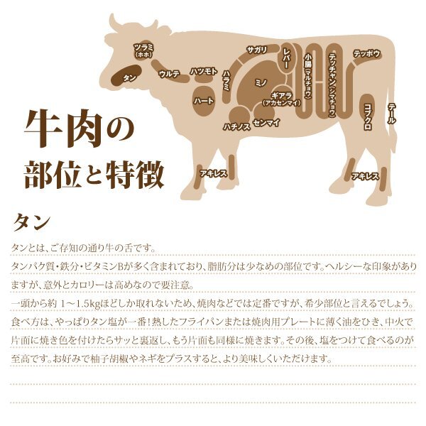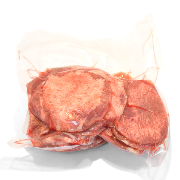 牛タンはその名前の通り牛の舌で、1頭に1本しかないため、今は大変高価で手に入れにくい商品です。焼肉・オードブル・軽く炙ってサラダなど幅広くご利用いただけます。 舌先をカットし、皮はむいてスライスした商品になります。解凍後すぐお召し上がりいただけます。 ※1本(約500~600g)をスライスしたものを冷凍便にてお届け致します。商品性質上質量に多少のばらつきがありますが、ご了承いただける方のみご入札下さい。 |