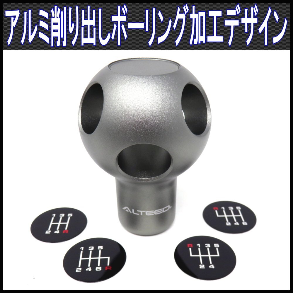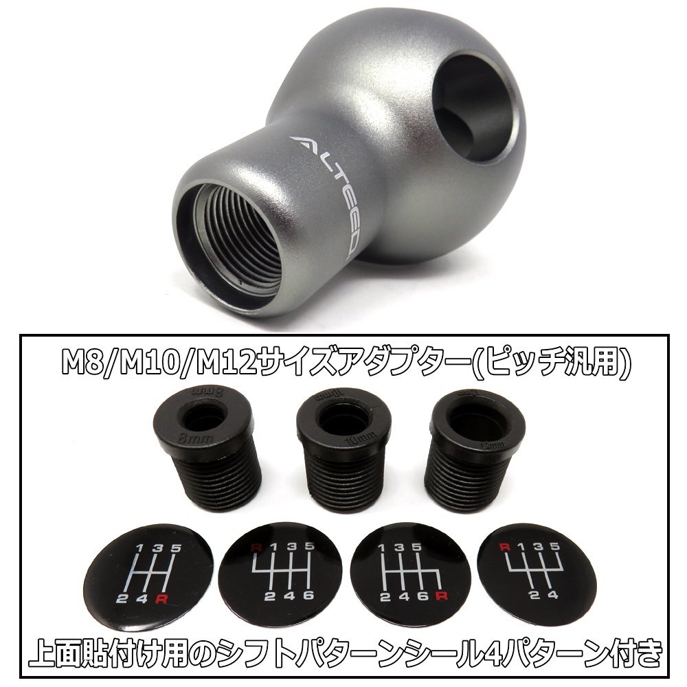 | □アルミ削り出しのシフトです □ボーリング加工によるアートなデザイン、表面穴部は面取り加工を行っていますので手に引っ掛かりません □M8/M10/M12、3種のアダプターと4パターンのシフトパターンシール付きです |