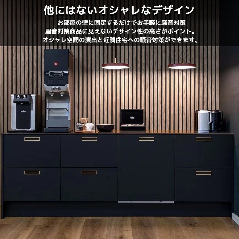 ■デザイン性と機能性を備えた吸音ウォールパネル 木と吸音クッション材を組み合わせた壁パネル軽量タイプで賃貸にも施工できます。 寝室やリビングなど反響や騒音を抑えつつお部屋を おしゃれな雰囲気に変えてくれます。 ■冷暖房効率UP クッション層の無双にある空気孔が温度を保つため遮熱します。 冷暖房効率が上がり消費電力を軽減します。 ■静かで落ち着いた暮らし 近隣からの騒音が気になるベッドルーム等の壁面に設置することで近隣からの騒音を軽減し、静かで落ち着いた生活ができます。 ■自由にカット クッション材の部分はカッターで切ることができます。 木材の部分も柔らかく加工がしやすくノコギリを使ってカットすることが出来ます。 軽量タイプ クッション材が基盤のウッドパネルなので1枚あたりの重量が約2kgと軽量。 施工効率が良く女性でも手軽にDIYすることが出来ます。 ■商品詳細 カラー:ナチュラルウッド サイズ(約):高さ800mm、横305mm、奥行き22mm 重さ(約):1枚あたり2kg 素材:木材(MDF)、吸音材:ポリエステル 施工面積(約):1.44平方メートル |
