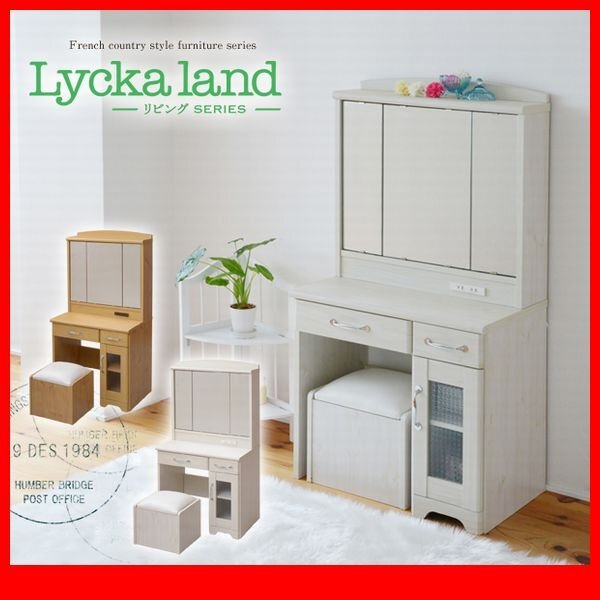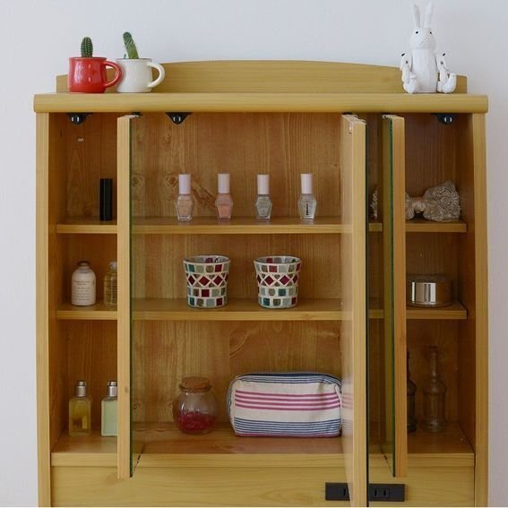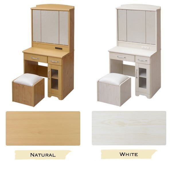 | スタンダードなカラーでシンプルな三面鏡ドレッサー。 お得なセットのスツールは座面の中に収納可能なスペース付。 広めの引出しと、小さめの引出し、背の高いものも収納できるガラス扉収納スペースもあり、 ミラーの裏側にも収納できるので、メイクアップに必要なものを大量収納できます。 2口コンセント付きなので、ドライヤーやヘアアイロンもドレッサー周りでご使用いただけます。 |