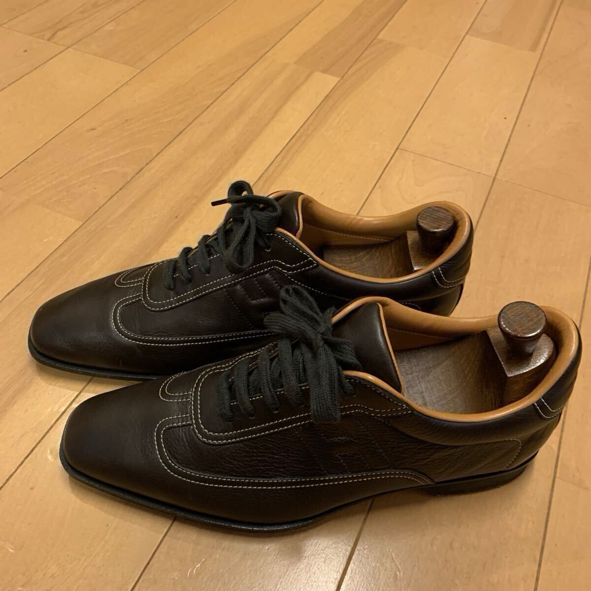 数年前に購入しましたが、足幅広の私には合わず、しまい込んでいました。サイズ表記は42で、私の日本サイズは26.5cm です。傷・汚れ・擦れはありませんが、写真でご確認ください。シューツリーは付属しませんが、オレンジカラーノルウエー布袋はおつけします。