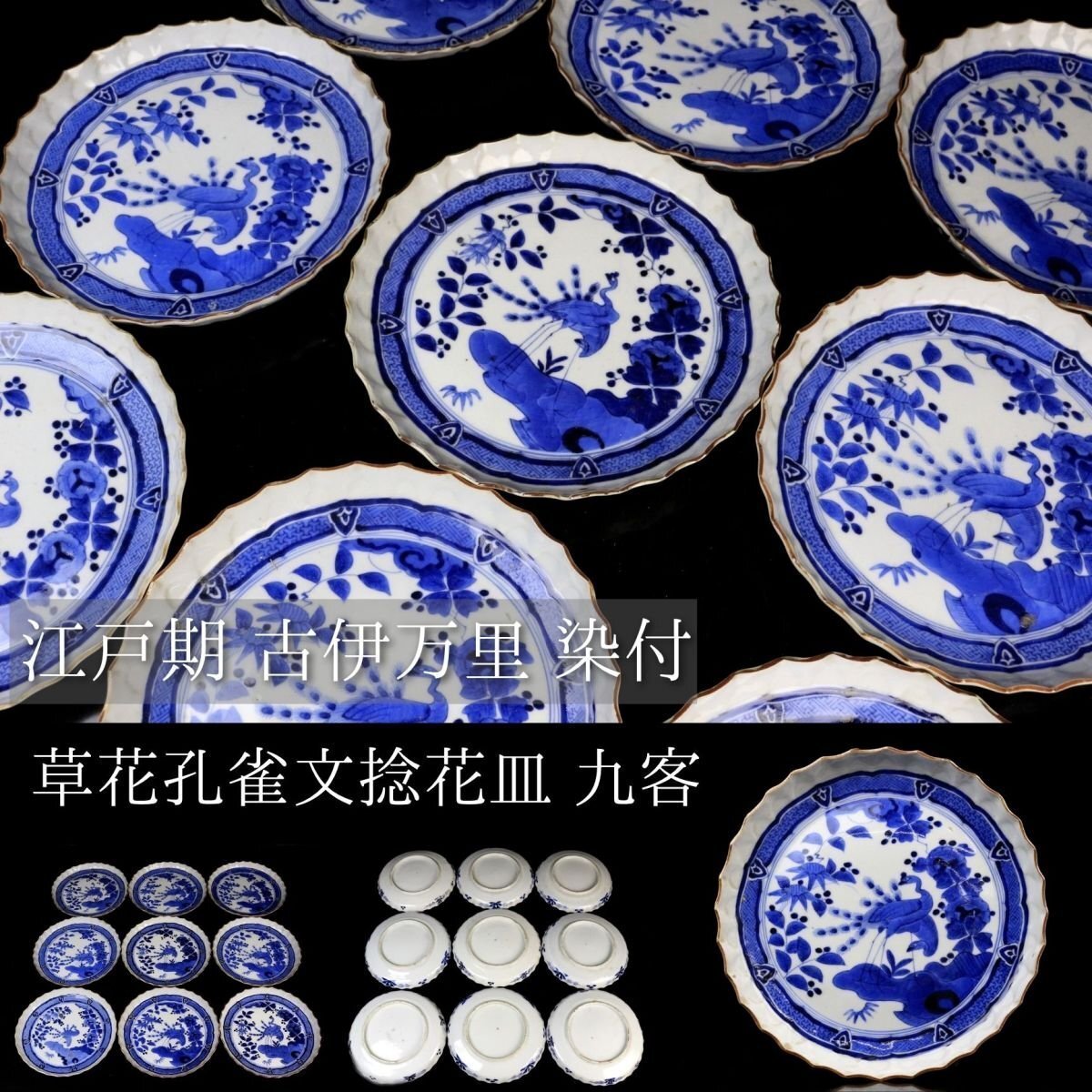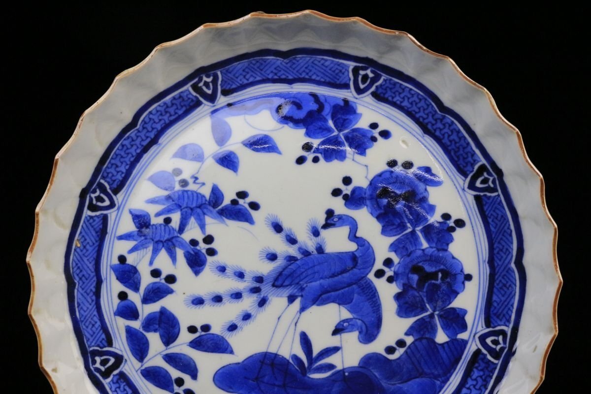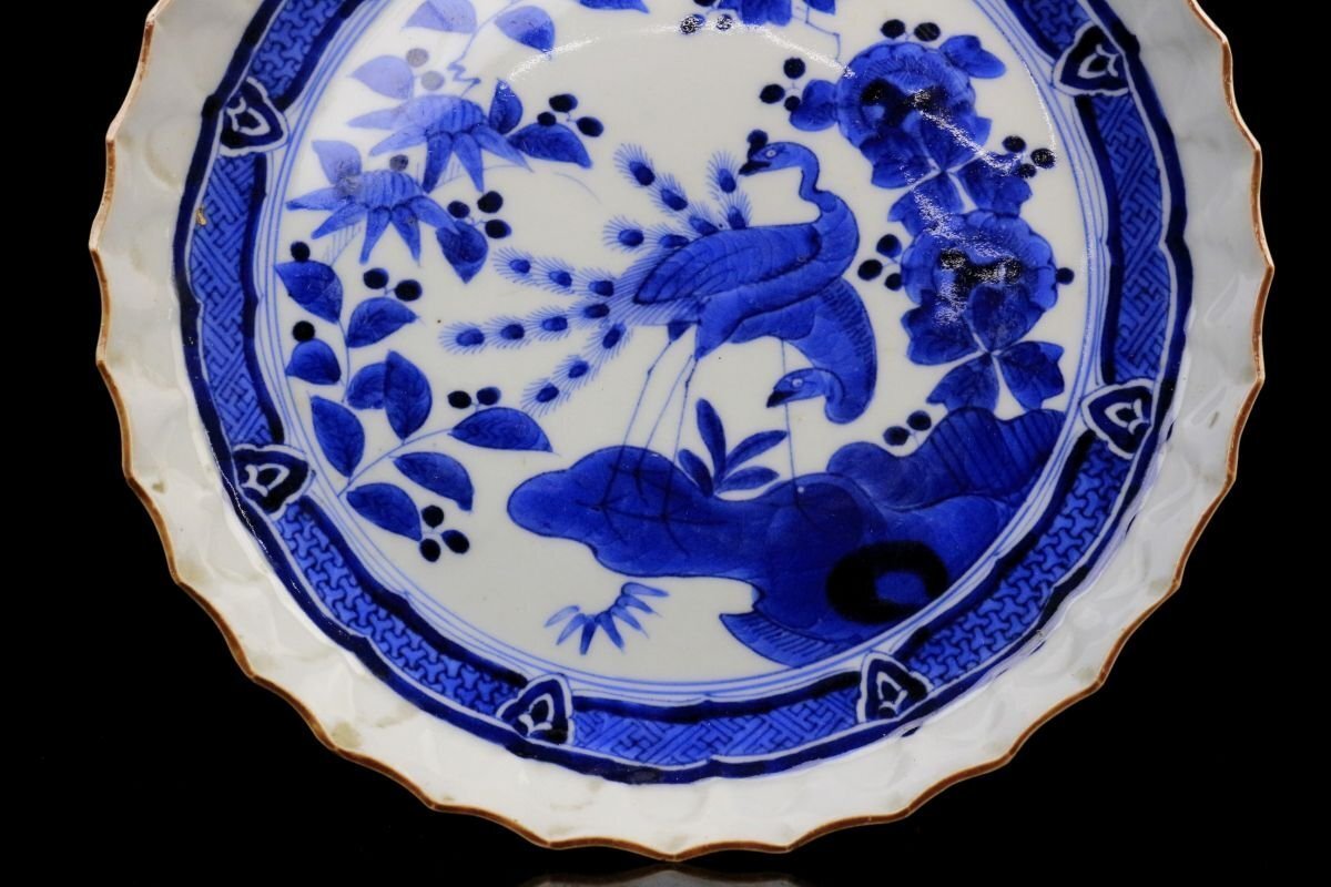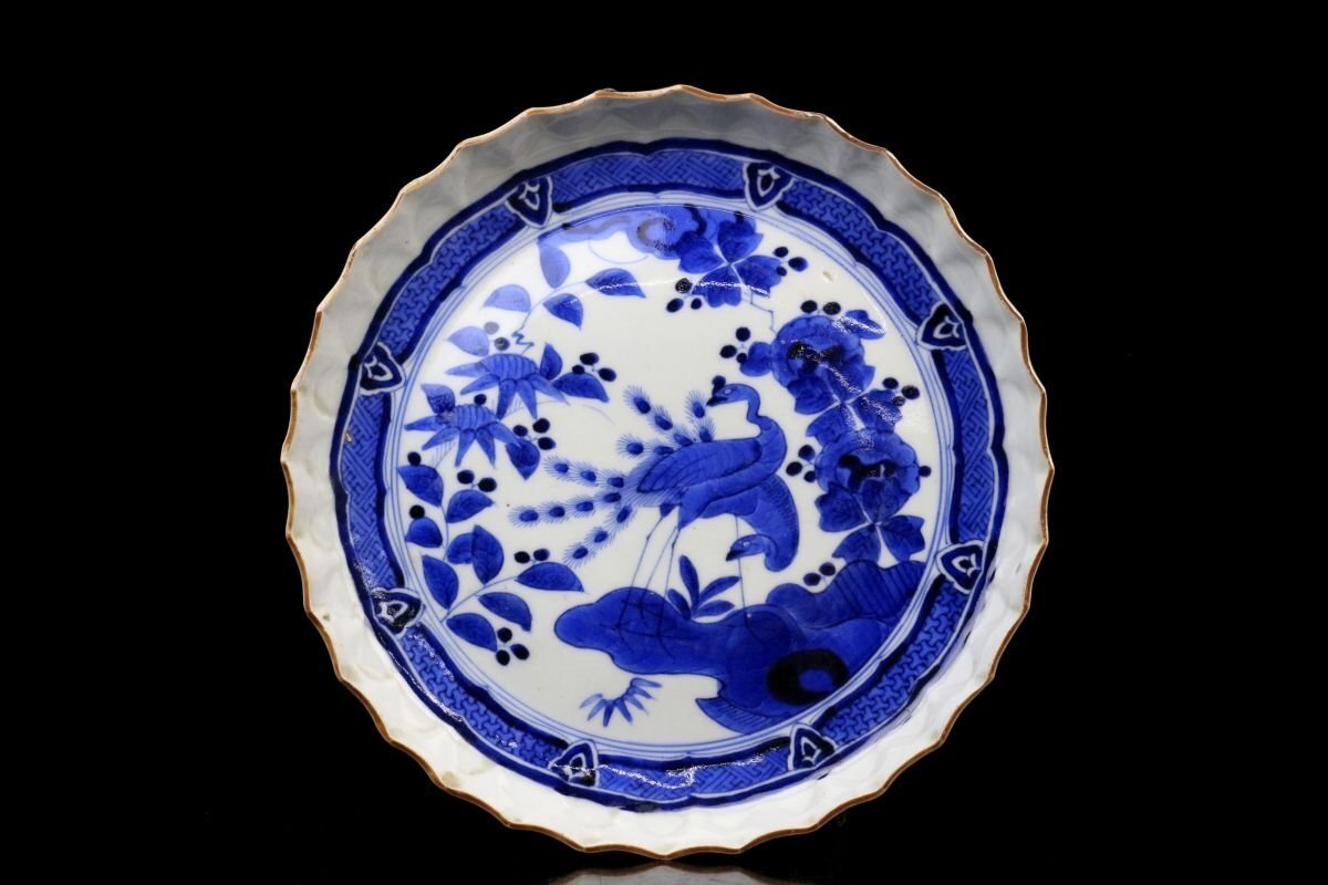 [.TY]25.05 25052815 A* * * 商品詳細 * * * ここでしか出逢うことのできない唯一の美をご紹介させて頂きます。 古伊万里 染付 草花孔雀文 捻花皿 九客 ― 七寸の美、静謐なる青の世界 ― 見事な発色を誇る染付により、気品ある孔雀と繊細な草花が描かれた九客の七寸皿。放射状のように広がる縁の捻花が、まるで大輪の花が咲き誇るかのような優美な意匠を生み出し、見る者を魅了します。 また、縁には「縁紅(ふちべに)」と呼ばれる鉄さび色の縁取りが施され、白磁の美しさと青の濃淡を一層引き立てます。この技法は、明末の中国・景徳鎮にて確立されたもので、器全体をまるで一幅の絵画のように額装し、文様の深みと格式を際立たせます。 捻花と縁紅、気品ある染付が融合したこの皿は、単なる器を超え、美術品としての存在感を放ちます。格式ある席にもふさわしく、また飾り皿としても目を楽しませてくれる逸品です。 時代を越えてなお色褪せぬ、伊万里の雅。心に響く静かな贅沢をこの機会に是非ご堪能下さい。 ■商品内容/ 皿九客 ■サイズ/横21.5㎝×高3㎝ ■状態/ スレ、傷、汚れ、欠け、ニュウ、窯被がございます。 ※写真にてご確認、ご了承の上ご入札下さい。