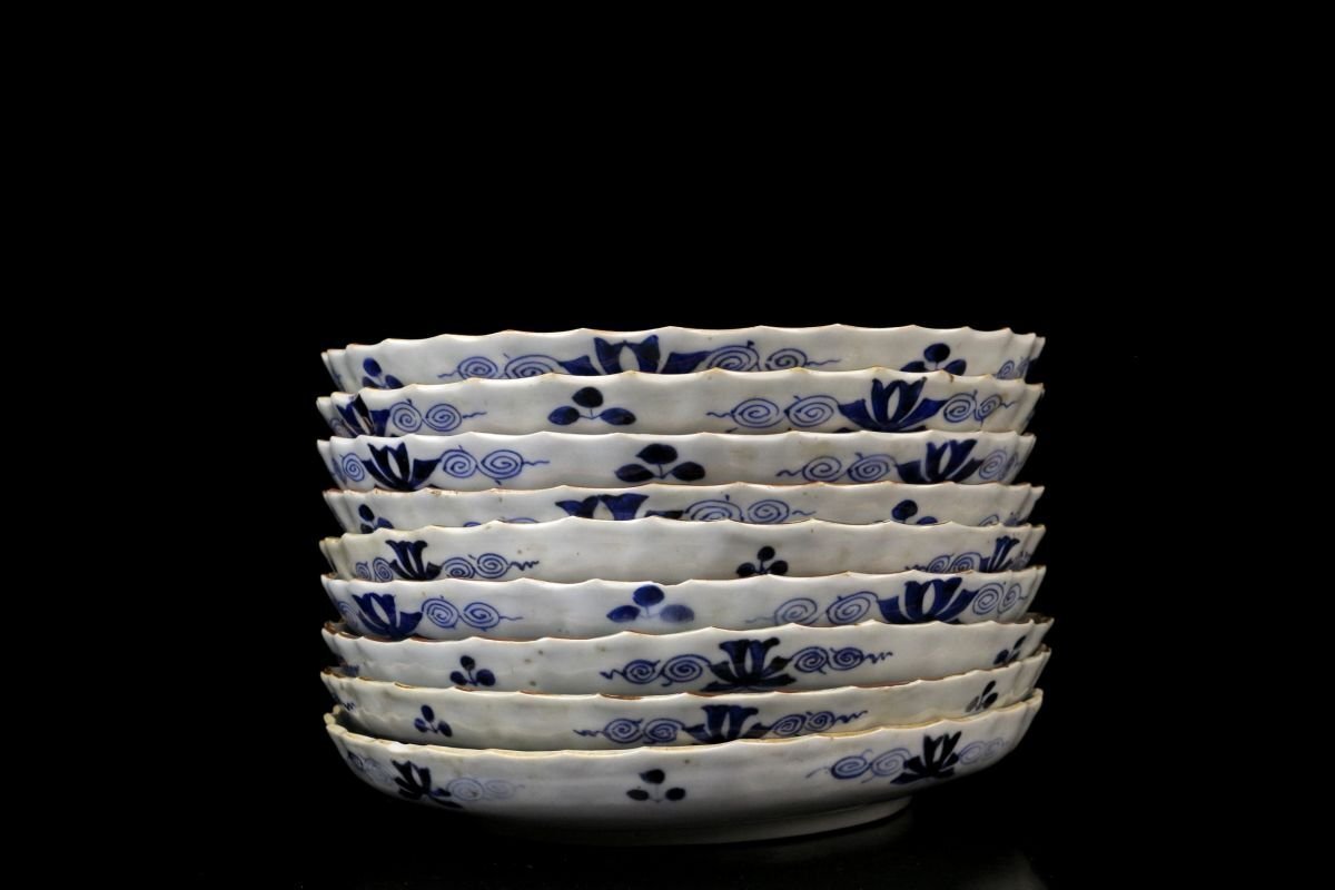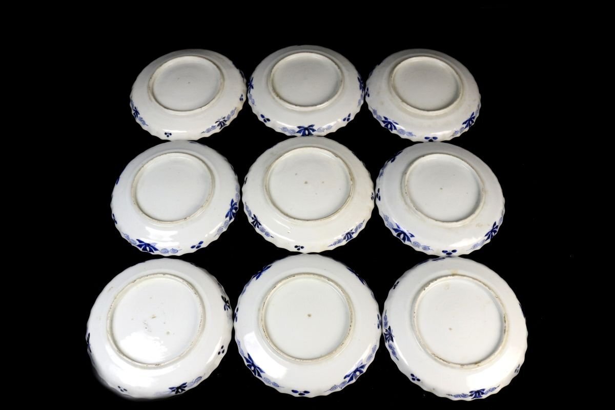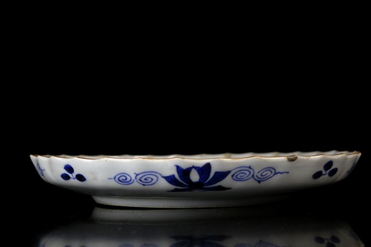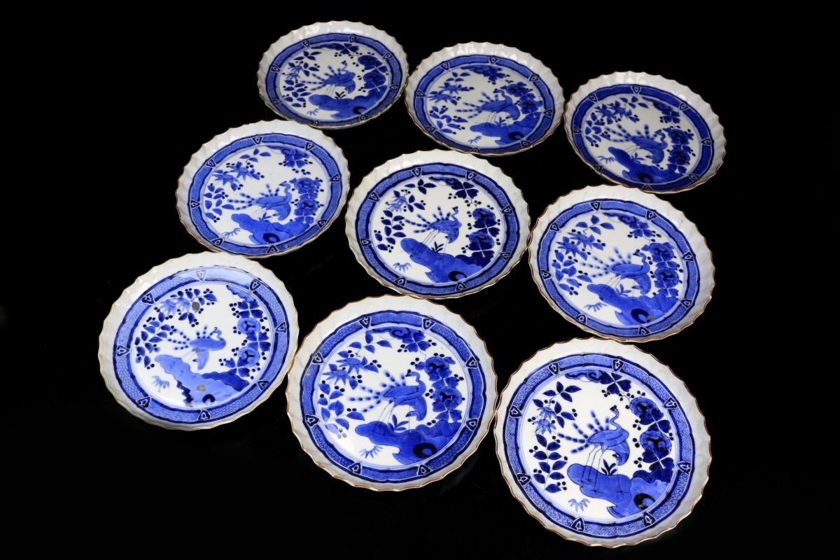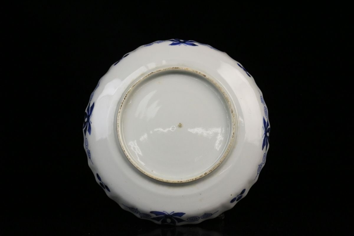 [.TY]25.05 25052815 A* * * 商品詳細 * * * ここでしか出逢うことのできない唯一の美をご紹介させて頂きます。 古伊万里 染付 草花孔雀文 捻花皿 九客 ― 七寸の美、静謐なる青の世界 ― 見事な発色を誇る染付により、気品ある孔雀と繊細な草花が描かれた九客の七寸皿。放射状のように広がる縁の捻花が、まるで大輪の花が咲き誇るかのような優美な意匠を生み出し、見る者を魅了します。 また、縁には「縁紅(ふちべに)」と呼ばれる鉄さび色の縁取りが施され、白磁の美しさと青の濃淡を一層引き立てます。この技法は、明末の中国・景徳鎮にて確立されたもので、器全体をまるで一幅の絵画のように額装し、文様の深みと格式を際立たせます。 捻花と縁紅、気品ある染付が融合したこの皿は、単なる器を超え、美術品としての存在感を放ちます。格式ある席にもふさわしく、また飾り皿としても目を楽しませてくれる逸品です。 時代を越えてなお色褪せぬ、伊万里の雅。心に響く静かな贅沢をこの機会に是非ご堪能下さい。 ■商品内容/ 皿九客 ■サイズ/横21.5㎝×高3㎝ ■状態/ スレ、傷、汚れ、欠け、ニュウ、窯被がございます。 ※写真にてご確認、ご了承の上ご入札下さい。