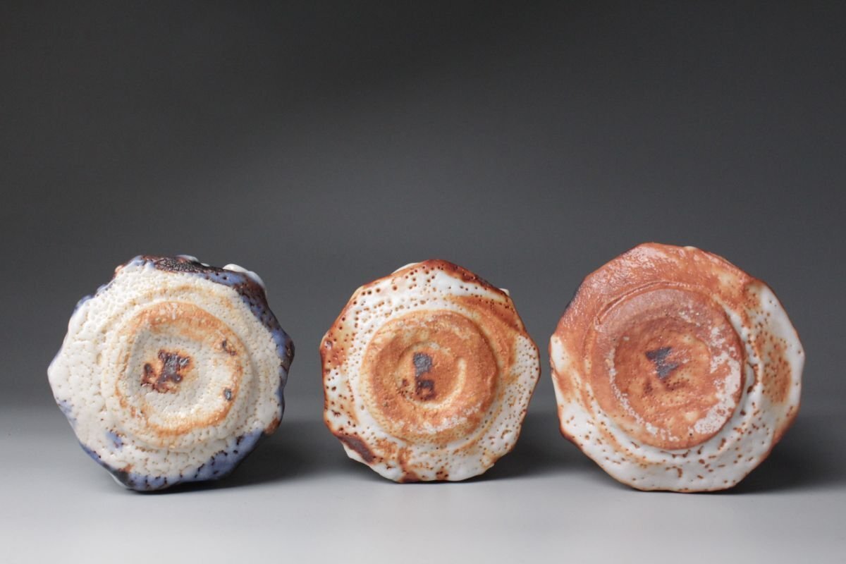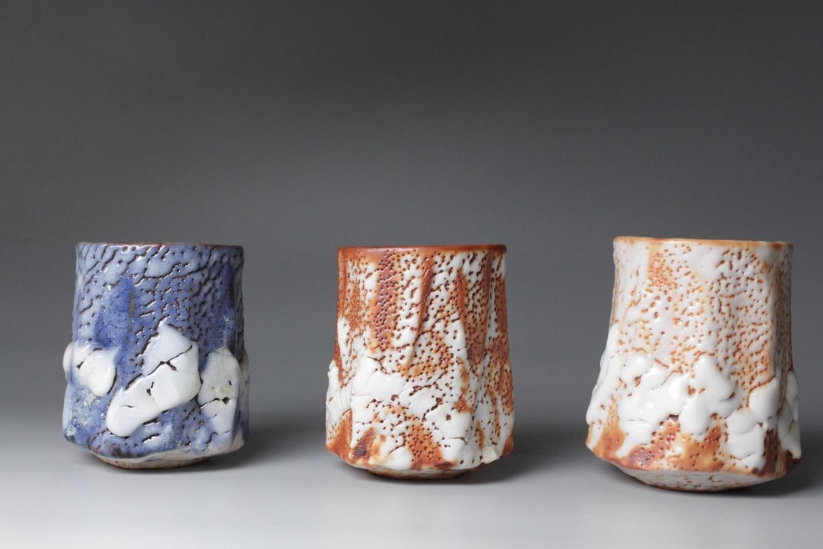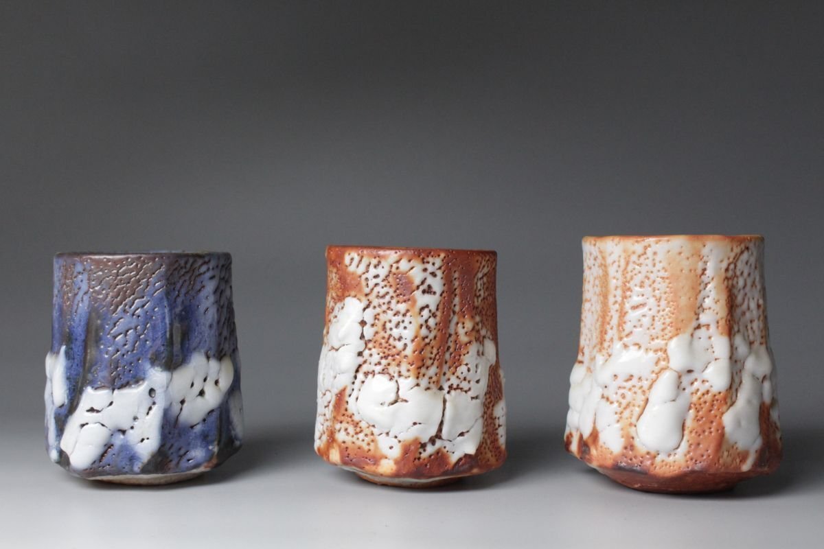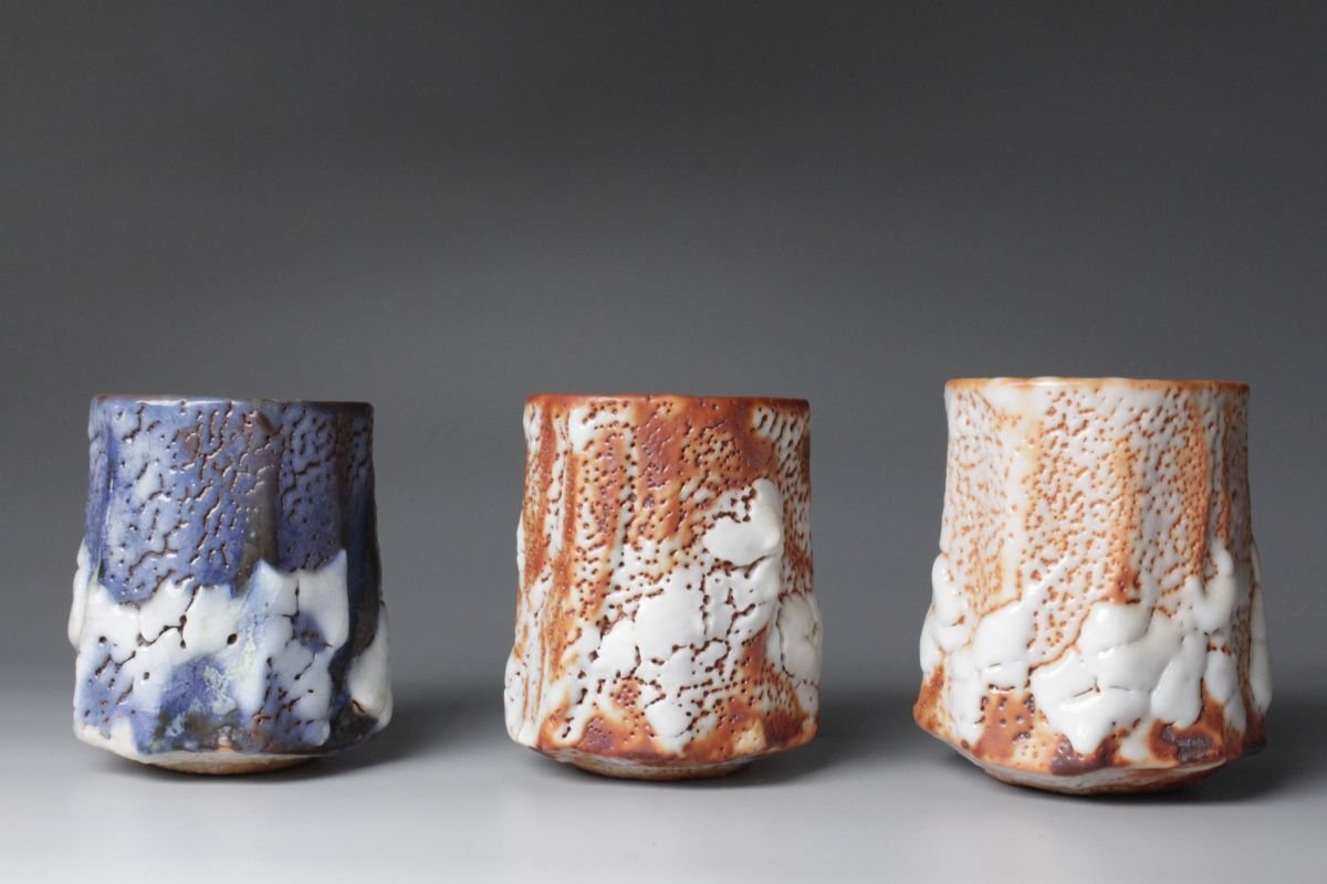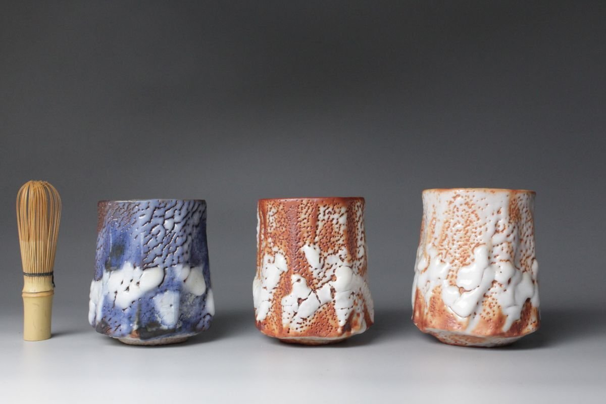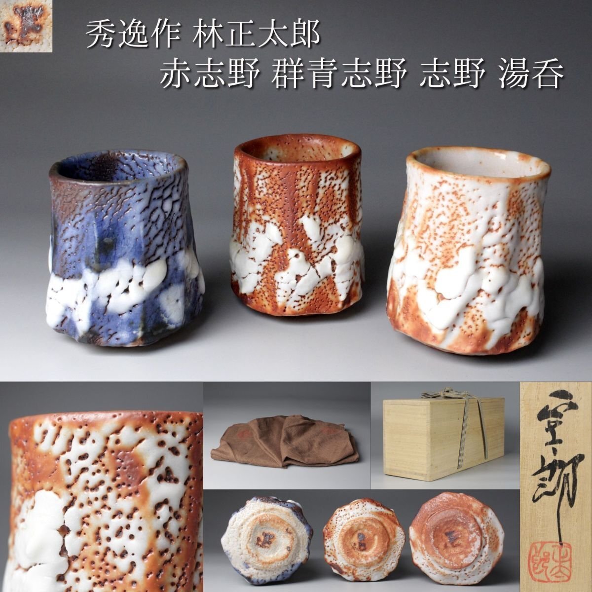 [.OE]25.09 25091404 T* * * 商品詳細 * * * ここでしか出逢うことのできない唯一の美をご紹介させて頂きます。 現代志野を代表する陶芸家・林正太郎による本作は、志野焼に赤志野と群青志野を加えた調和の美を感じさせる志野の魅力を存分に引き出した秀逸作です。 人間国宝・荒川豊蔵に学び、その精神を継承しながら独自の探求を重ねてきた林正太郎ならではの作風が息づいています。 志野焼特有の柔らかな土味と厚みのある釉薬がもたらす温かみ、赤志野特有の力強い火色や群青志野の深遠で落ち着きのある藍色、土と炎の対話から生まれる豊かな景色を示し、単なる茶器を超えた幽玄の世界が広がります。表面には窯変による荒々しくも柔らかな表情が浮かび上がり、手に取る角度や光の加減によって異なる風情を見せ、まるで一期一会の茶会のようにその瞬間ごとの美を楽しませてくれます。 本品は湯を注いだときに一層引き立ち、使うほどに手に馴染み、愛着を深めていきます。林正太郎の湯呑は茶の湯の場における実用性と鑑賞性を兼ね備え、まさに「用の美」と「芸術性」の融合を体現しています。 茶人やコレクターにとって、本作はただの器ではなく、土と炎、伝統と革新、そして作家の美意識が結晶した作品であり、長く寄り添いながら共に歳月を重ねていくにふさわしい逸品です。 ■商品内容/ 湯呑3客、共布、共箱 ■サイズ/志野(左):横8.5㎝×高10.5㎝ 群青志野(中央):横8㎝×高10㎝ 赤志野(右):横8.5㎝×高10.5㎝ 箱:横11㎝×高14㎝×奥行32㎝ ■状態/ 僅かなスレ、小傷、汚れ、窯被、志野(画像左)の見込みに僅かな入 箱にスレ、小傷、汚れがございます。 ※写真にてご確認、ご了承の上ご入札下さい。