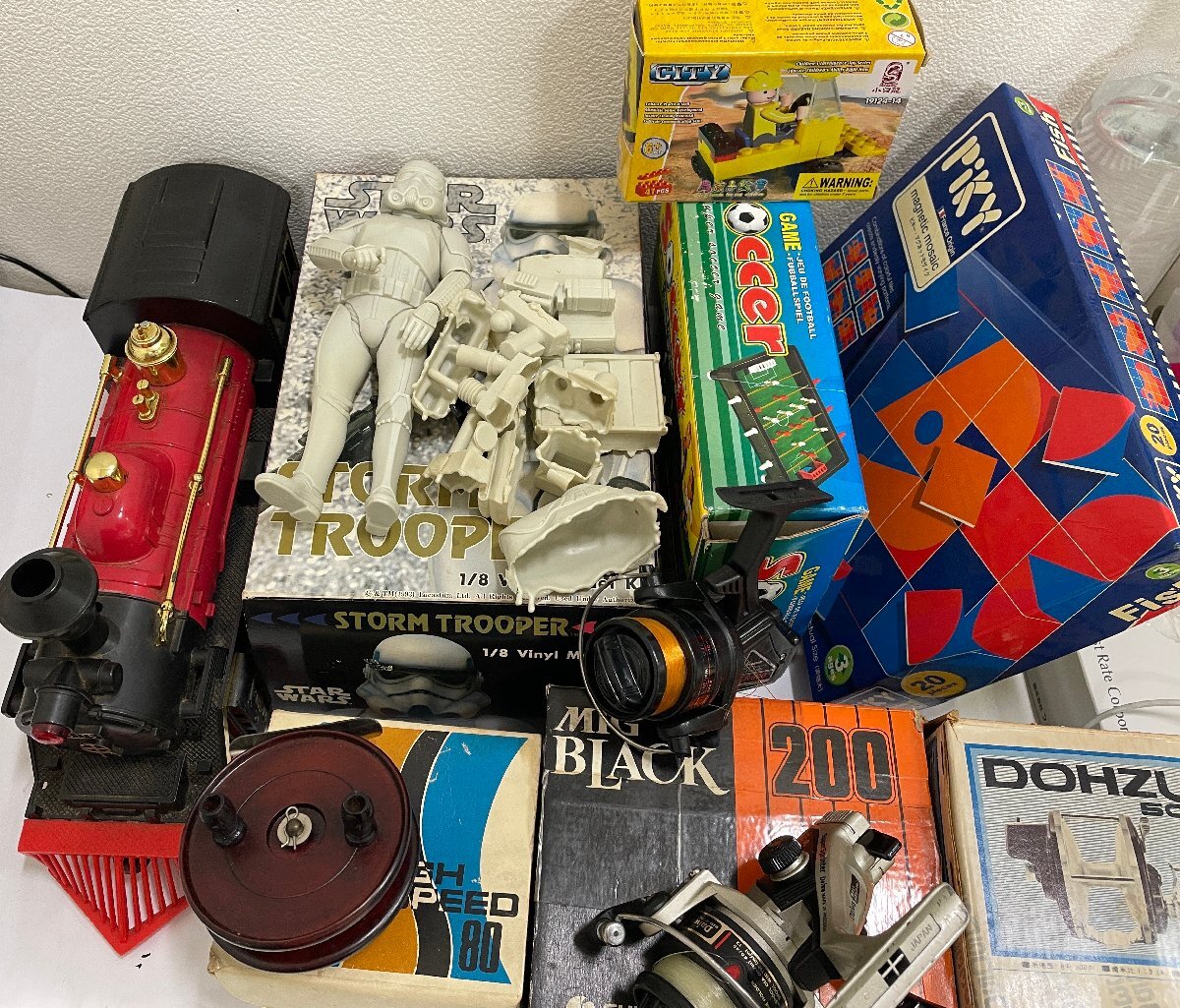 | 【J52354】お引越しお片付け雑貨おまとめ スターウォーズ フィギュア、ボードゲーム各種、SL、釣り用リール各種 動作未確認 ジャンク扱い |