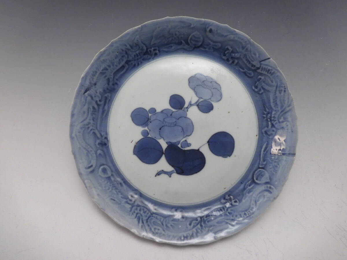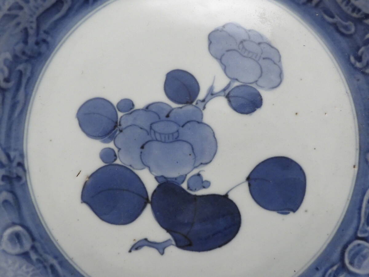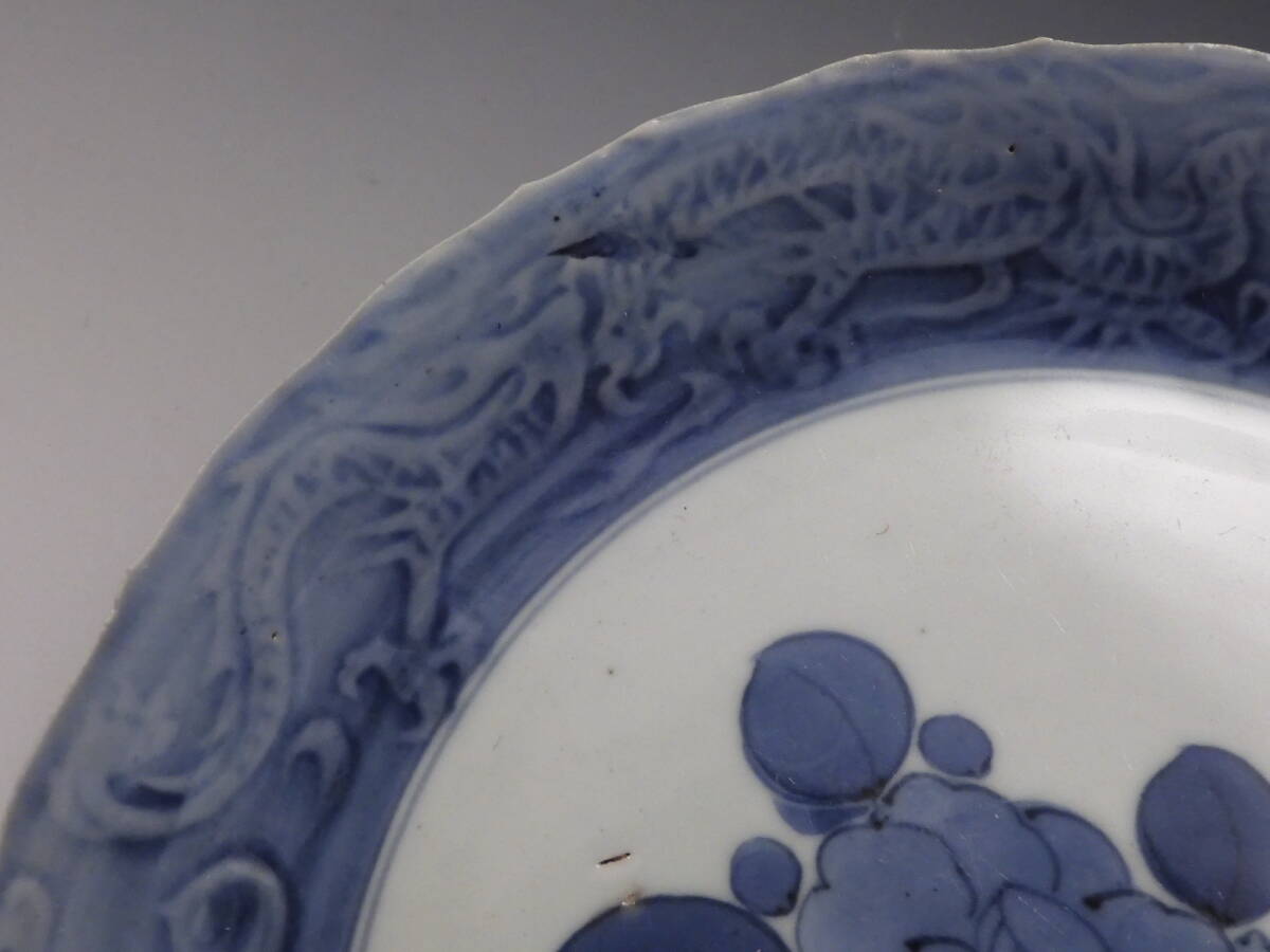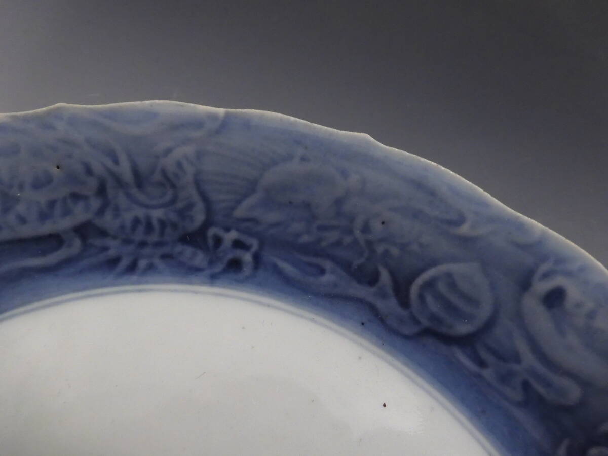 | ○梗○藍九谷 染付 花草文 陽刻 雲龍文 角福 飾皿 20.5cm 江戸期 K286◇ |