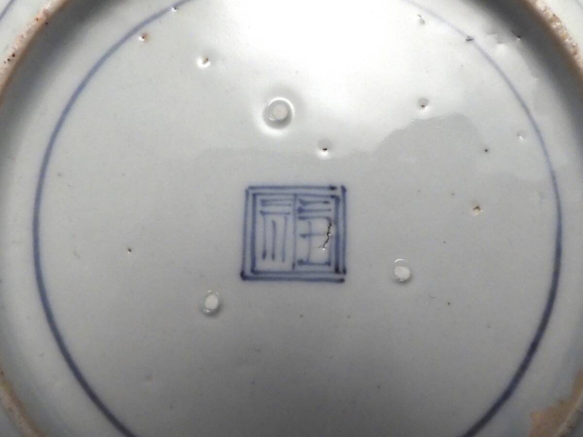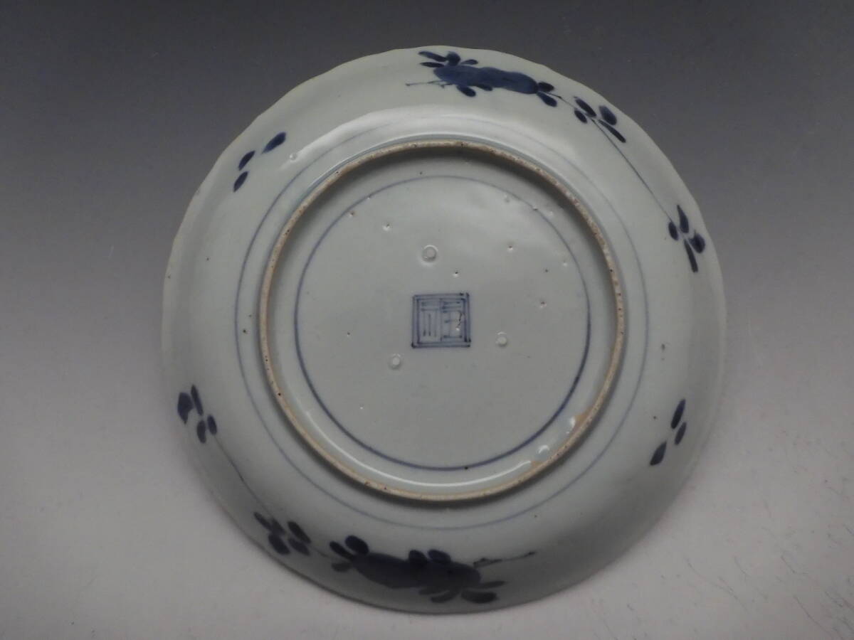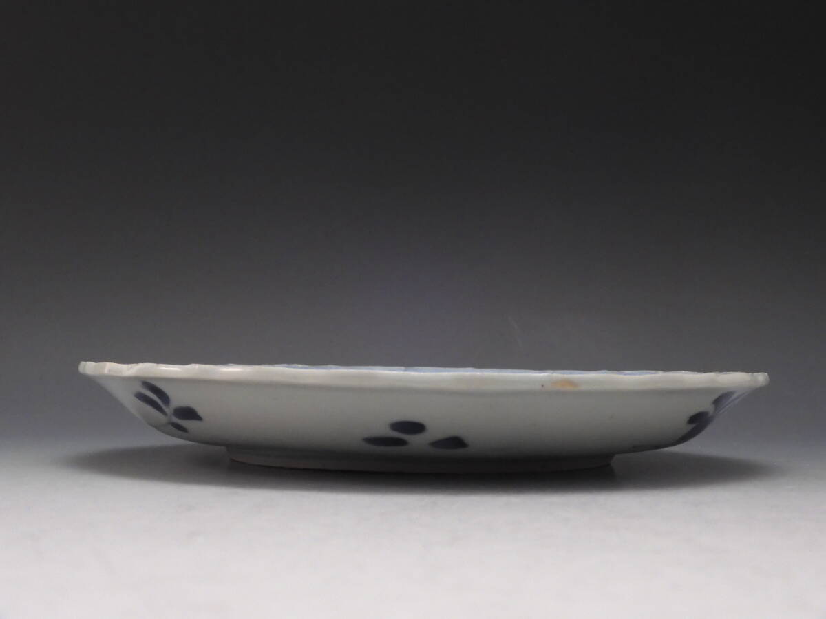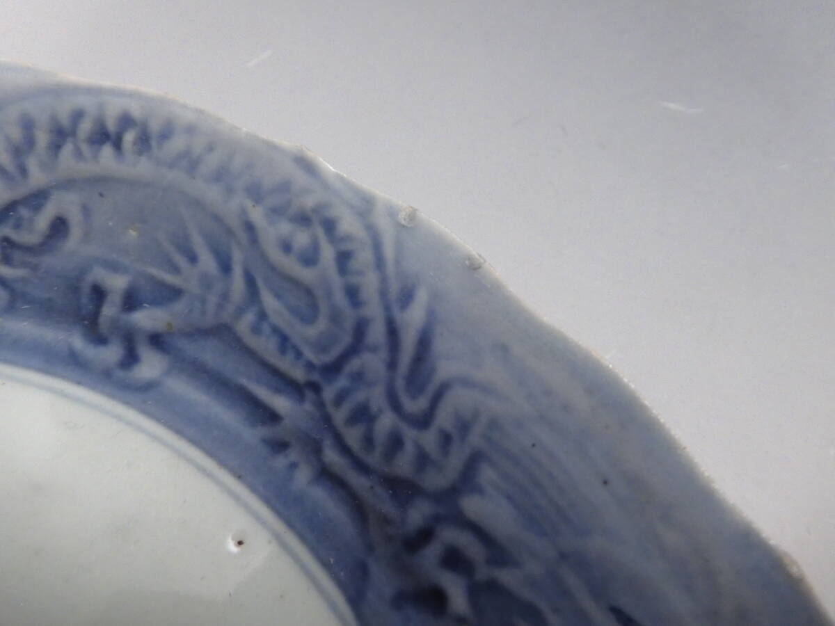 | ○梗○藍九谷 染付 花草文 陽刻 雲龍文 角福 飾皿 20.5cm 江戸期 K286◇ |