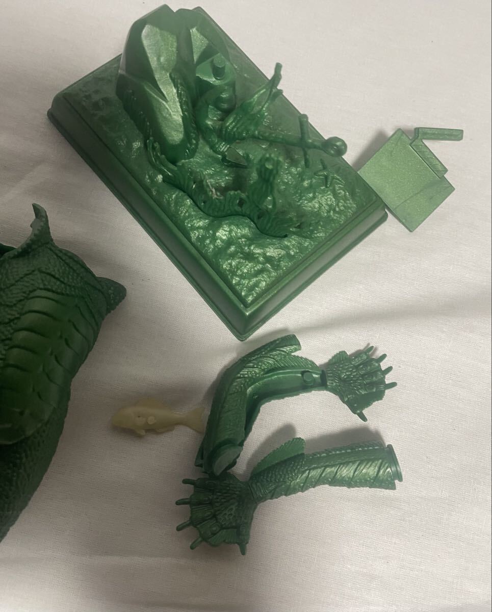30年ほど前に購入。AURORA「半魚人」。泳いでるタイプの半魚人。立ち姿の半魚人と二種ありましたがこちらは泳いでるポーズ。1/12こちらの箱絵も味があります。頭部と魚は夜光タイプ。その他の部品は揃ってます。部品は揃ってますが説明書がありません。ただ部品点数は少ないので組み上げるには問題ないかと思います。3Nでお願いします。古い物にご理解のある方の入札をお待ちします。落札後の入金連絡は3日以内でお願いします。では宜しくお願いします。
