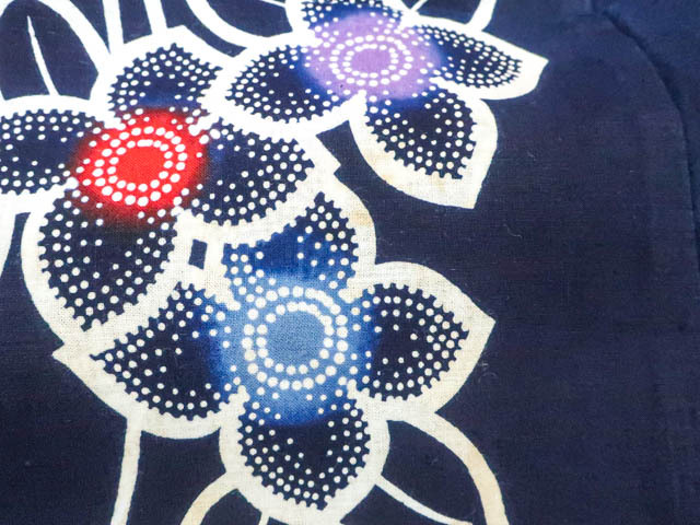肩当て・居敷当て付きです。後ろ身頃、衿、袖にすれ、汚れがございますが着用可能なお品です。 地色は 紺です。 1枚目の画像が近いお色かと思われます。 素材は綿です。 |