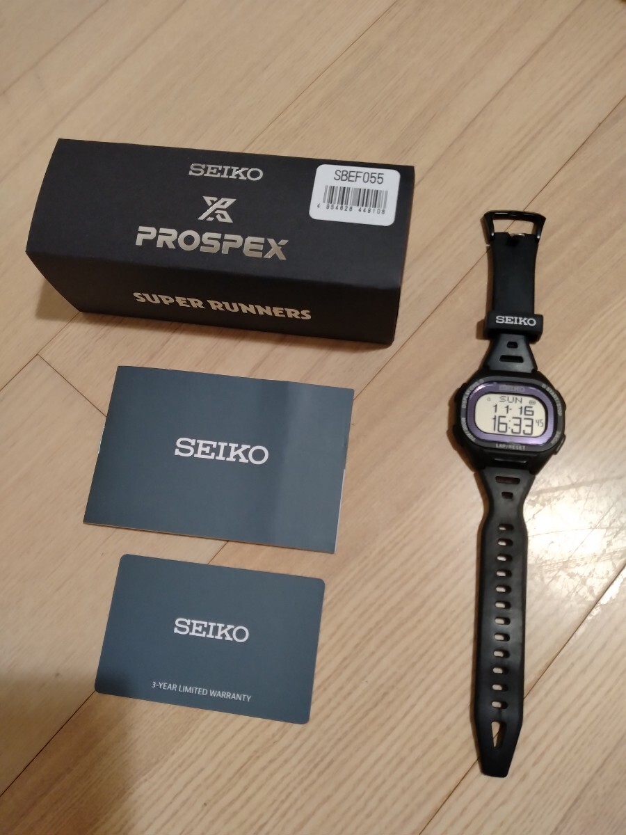 SEIKOメンズ 男性用ソーラー腕時計 プロスペックス スーパーランナーズ SBEF005です。(現行商品ですので、諸元・機能等についてはメーカーサイトを御参照ください。)今年の7月にAmazonで購入。付属品は箱、説明書、保証書(無記名)。多少の使用感は有りますが、気になるような傷や汚れの無い、良コンディションの品物です。