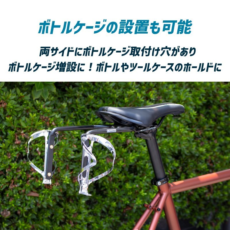 | 自転車の大型サドルバッグの横揺れが気になる方に! 荷物が多くなるにつれて不安定になり左右に振れたりする小さいストレスを解消 サドルバッグ揺れ防止保持フレームで気になっていたダンシング時の横揺れを防止します。 左右にボトルケージの設置も可能でボトルケージの増設にもお使い頂けます。 サドルレールに装着できるのでロードバイクからクロスバイクなど様々な自転車に対応します。 [簡単装着] サドルバッグケージはサドルレールに装着して利用します。 付属の工具ですぐに装着可能です。 ※カーボンレールへの装着はお控えください。 [サドルバッグを挟んで固定] サドルバッグケージでサドルバッグを挟む事で左右の揺れを防止します。 サドルバッグはしっかりと保持フレームに固定して下さい。 対応可能のサドルバッグの幅は最大約150mm [耐久性と軽量] 丈夫なアルミニウム製で耐久性と軽さを兼ね備えています。 装着していても重い感じにならない。 [ボトルケージ装着可能] 両サイドにボトルケージ取付穴がありボトルケージ増設ができます。 ボトルやツールケースのホールドに。 商品内容商品内容:サドルバッグケージ本体、取付板、 M5*16ボルトx2、M5*10ボルトx 4、M5ワッシャx2;3mm六角工具、 日本語取扱説明書 材質アルミ合金 正味重量210g 外寸(約)幅17.5x突出し15.5x下がり16.5cm 内寸(約)幅13.9x突出し13.5x下がり14.0cm 対応可能のサドルバッグの幅最大約150mm | |