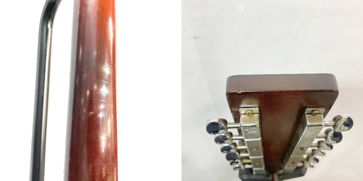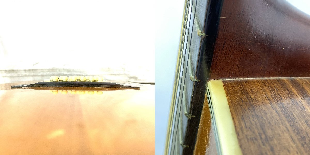 | ◆動作◆ ・★ネックにかなりの逆反りが見られます。 ・★フレットの残りは6-7割程度です。 ・★ブリッジに浮き、ネックヒール付近に隙間のようなヒビがあります。 ・★弦長(スケール):64cm ・★弦高:1弦 1mm 12弦 1.5mm(12フレット) ・★ナット幅:45mm ・★専門店ではない為、音の数値計測などはおこなっておりませんのでご了承ください。 ・★修理前提もしくは部品取りでお考え下さい。 |