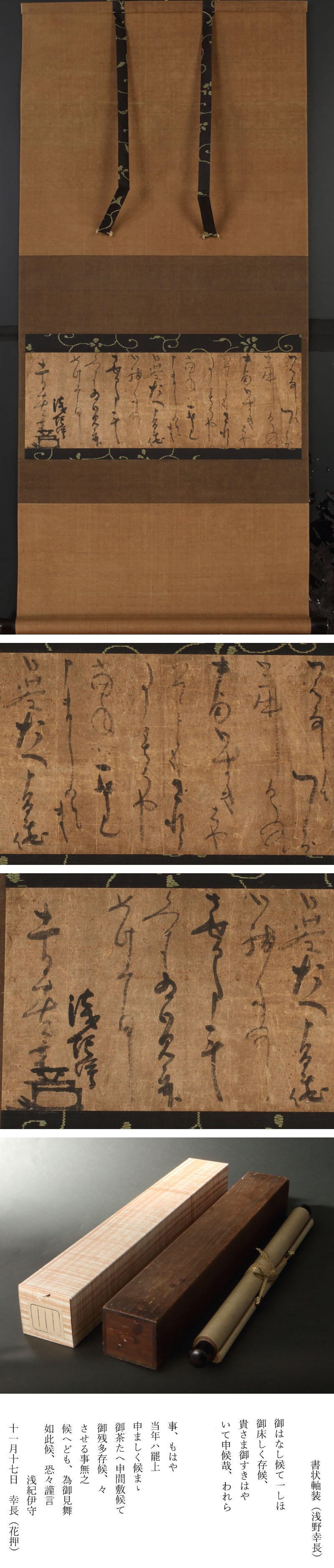 浅野幸長の消息です。 某人に宛て、先日の面会を謝し、当年は上京の機会がなく御茶を頂けないのが残念に思う旨を述べた書です。幸長は織部門下であり、親しい茶人に書き送ったものとみられます。慶長6(1601)年の紀伊守任官から同18(1613)年の死までに書かれた書状とみられます。 歴戦の勇将ながら文武両道で知られた戦国大名の、人恋しさ、率直な感情の吐露が心に響く逸品です。 ◆浅野幸長 織豊-時代前期の大名。浅野長政の長男。豊臣秀吉に側近としてつかえ,小田原攻め,朝鮮出兵に出陣。その功により父とともに甲斐1国をあたえられた。のち豊臣秀次事件に連座して,一時能登に流される。関ケ原の戦いでは徳川家康に属し,慶長5(1600)年紀伊和歌山藩主浅野家初代となった。37万6500石。慶長18(1613)年没、38歳。 〔本文〕 御はなし候て一しほ 御床しく存候、 貴さま御すきはや いて申候哉、われら 事、もはや 当年ハ罷上 申ましく候まゝ、 御茶たへ申間敷候て 御残多存候、 させる事無之 候へとも、為御見舞 如此候、恐々謹言 浅紀伊守 十一月十七日 幸長(花押) 付属:時代箱が付属します。 寸法:高さ98cm、幅45cm(最大幅。若干の誤差はご了承下さい) 状態:経年のイタミがございます。 |