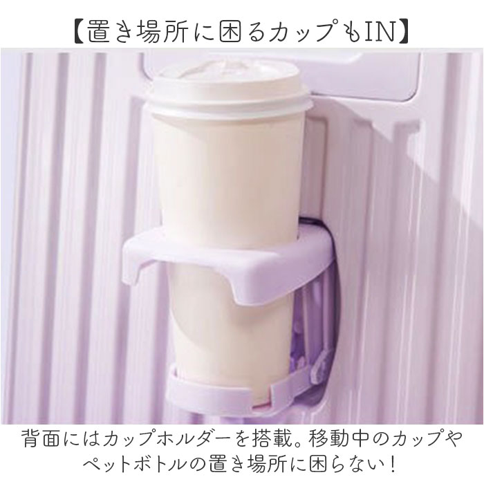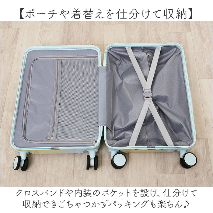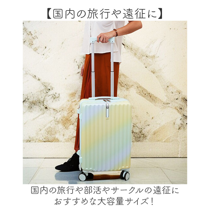 | 商品説明 | ・・【気分があがるグラデーション♪】 ・旅行がもっと楽しくなる♪可愛いグラデーションカラーと機能性が魅力なキャリーケース。 ・【国内の旅行や遠征に】 ・国内の旅行や部活やサークルの遠征におすすめな大容量サイズ! ・【ポーチや着替えを仕分けて収納】 ・クロスバンドや内装のポケットを設け、仕分けて収納できごちゃつかずパッキングも楽ちん♪ ・【置き場所に困るカップもIN】 ・背面にはカップホルダーを搭載。移動中のカップやペットボトルの置き場所に困らない! ・【沢山お土産を買っても安心】 ・フロントは折り畳み式のフックを配置。紙袋やエコバックの吊り下げにピッタリ。 ・【安心のロック機能付き】 ・盗難防止のロック機能付き♪ナンバーロックなので鍵の紛失の心配もなし☆※1 ・【充電可能なUSBポート】 ・中のコードとモバイルバッテリーを繋げれば、そのまま充電できるUSBポート機能。※2 ・【高さ調節ができるハンドル】 ・ハンドルは2段階調節ができ、女性から男性まで移動しやすい高さに調節可能。 ・【手持ちもしやすいハンドル】 ・ちょっとした段差や階段を通るときに便利なハンドル付きで手持ちでも持ちやすい◎ ・【スムーズな走行が可能】 ・8つの車輪と360度回転するキャスターで、左右前後どの向きの走行もスムーズに。 ・【丈夫で傷が付きにくい】 ・ABSとPC(ポリカーボネート)を組み合わせた作りで、表面に傷が付きにくく丈夫なのも◎ ・【ポケット仕様】 ・メインルーム・・・ファスナーポケット×2、クロスバンド付き収納スペース×1 ・【注意事項】 ・※1 TSA機能はございませんので、海外空港の荷物検査の際はご注意ください。 ・※2 オス/typeA メス/typeA ・オスのケーブル以外付属のケーブルはございません。 |