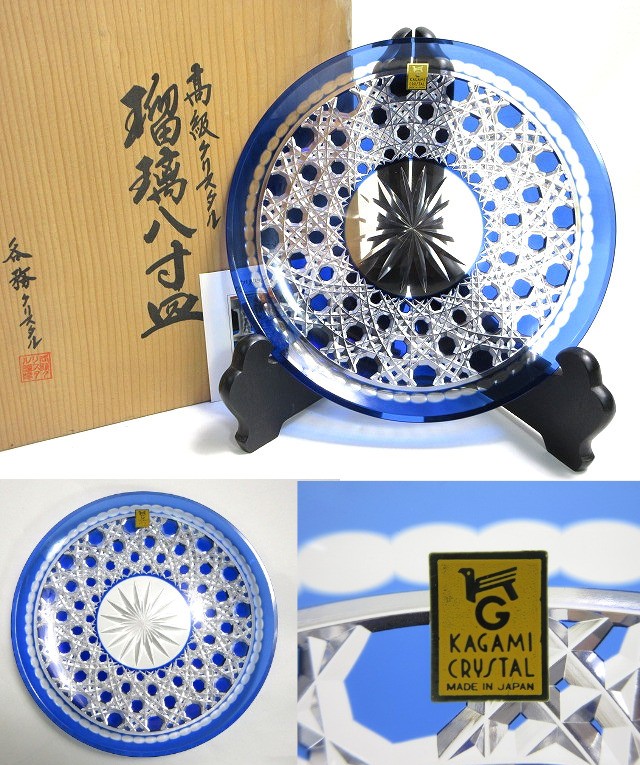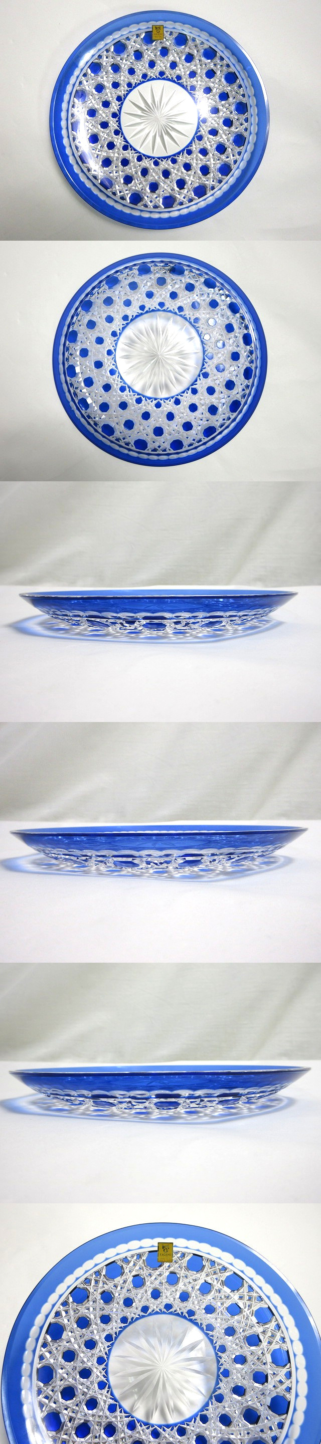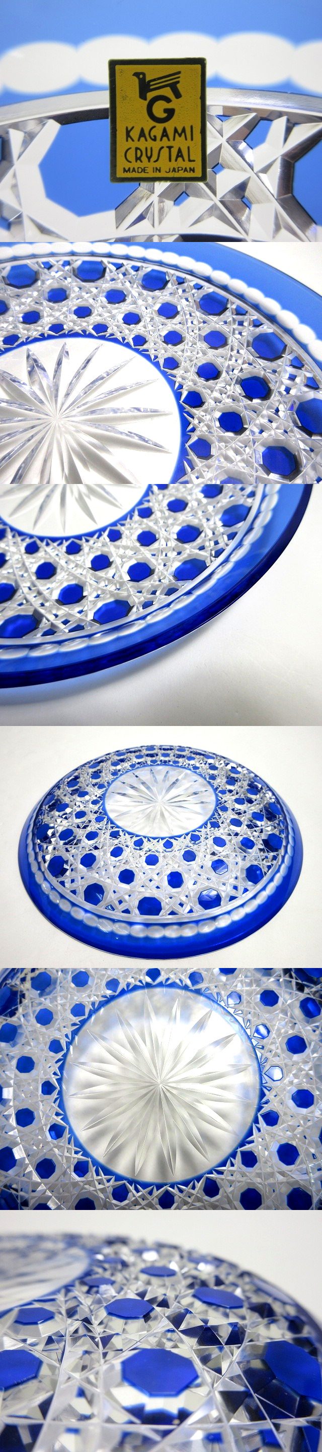 P050 美品 カガミクリスタル 高級クリスタル 瑠璃八寸皿 共箱 径:約20.2cm【説明欄に詳細写真有り】