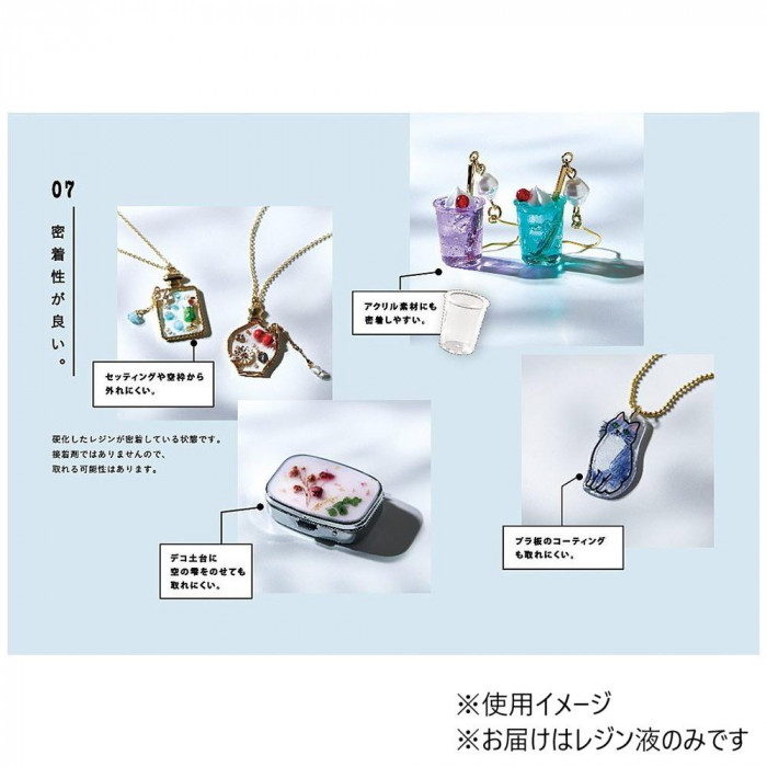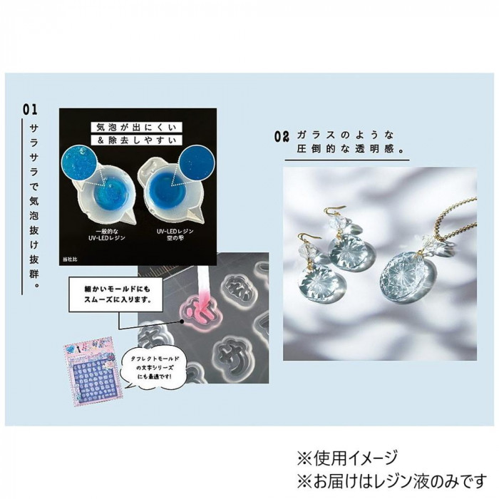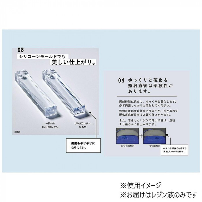 | サラサラとした低粘性の1液性UV-LEDレジンです。粘性の低いサラサラなレジン液なので、気泡も除去しやすいです。硬化による歪みが少なく、ガラスのような透明感です。シリコーン型でもギザギザになりにくく、きれいな仕上がりです。反りにくく、密着性が良いです。サラサラで気泡が出来にくく、除去しやすいので、レジンが初めての方からレジン作家まで幅広くご使用いただけます。 【ご使用方法】 1.モールド等にレジン液を入れます。 2.UV-LEDライトやUVライト等にて両面照射して硬化させます。 3.熱が少し冷めたら、やさしく取り出します。 【向いている作品】 ・シリコーンモールドをはじめとする、モールドを使用した作品に向いています。 ・透明度が高いので、シールやパーツ等を封入してもクリアに見えます。 ・反りにくいので、薄くて大きいプレート制作もおすすめです。 ・セッティングやデコ土台に密着しやすい作品に向いています。 ・サラサラなので小さくて細かいモールドにもおすすめです。 【向いていない作品】 ・瞬間硬化が必要な作品には向きません。 ・粘性が低いので、ぷっくりさせたい時には向きません。 ※ベタつきが無くなるまで、両面しっかりと照射して完全に硬化させてください。 ※本品は、部屋の蛍光灯や窓際(日陰)でもゆるやかに硬化反応が始まります。 ※本品を出した状態で長時間放置しないようご注意ください。 ※肌の弱い方や注意が必要な環境で作業を行う方は、手袋やメガネなどをして作業することをおすすめします。 ※使用中や硬化時は必ず換気を行ってください。 ※硬化中は高温になります。皮膚に付着させないようご注意ください。 ※経年劣化による樹脂特有の変色が起こる場合があります。 ※また、硬化時に、必要以上にUV-LEDライトを当てすぎますと、黄色味が出る場合がございます。 ※硬化直後は柔軟性がありますが、熱が取れて硬化反応が終わると硬く仕上がります。 ※また、着色したレジンの薄い作品は、透明より柔らかく仕上がります。 ※硬化時間は、作品の厚みや季節により異なります。 |
