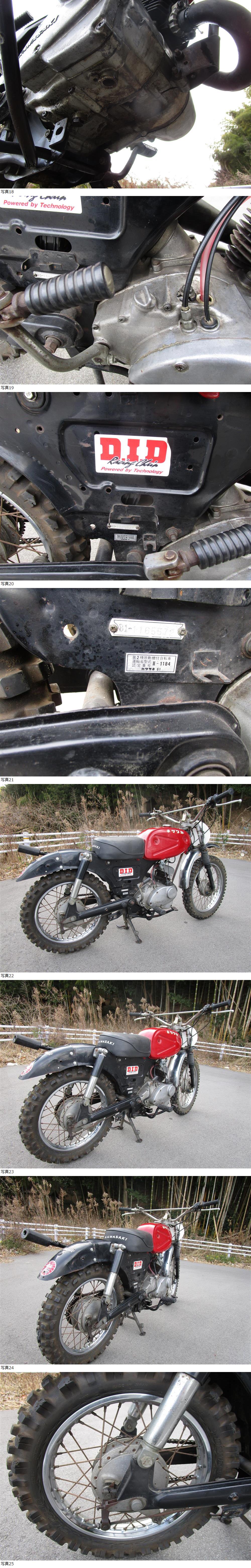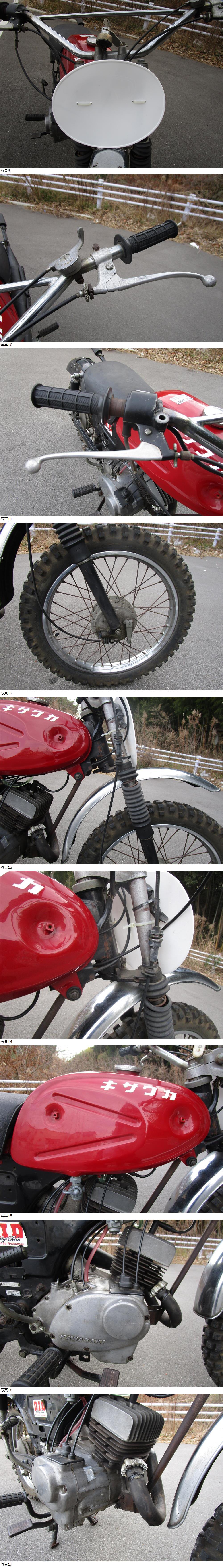 ★★車体番号B1-1165~ 恐らく1976年のKC125B1をベースに当時物のB8赤タンクモトクロッサーのレプリカカスタムを施した車両です。 ★入庫後ガソリンラインの変更、プラグ交換(チャンピオン)キャブレター分解洗浄、バッテリー4LBタイプ新品交換等をしてエンジン始動走行に至りました。オイルタンクは取り外してあり混合仕様です。現在ヤマハのオートルーブオイル25対1(古いので少し濃い目)にしています。オイルポンプは内部にありました。 ★カスタム内容は、見える範囲でフロント18インチホイール(純正は16インチ) ワンメイク左だしチャンバー、タンク内部コーティング、タンク業者塗装(エンブレムは貼り付け後リペイントしてあります) ★ミッションはオリジナルの4速ロータリー確認済みです。 ★50年程の古い車両ですが、なかなか出てこない車両なのでこの機会にご検討ください。 ★始動はセル、キック供始動確認できました。 このような車両なので書類はございませんが、必要ならば販売証明書付属させます。落札後お申し付けください鍵はコピーキー1本です。 ★走行動画をアップしています。外観等も合わせて参考にしてください。走行動画はこちらから⇒ https://youtu.be/7FFguH-cjF8 ★富田林市からの出品です。