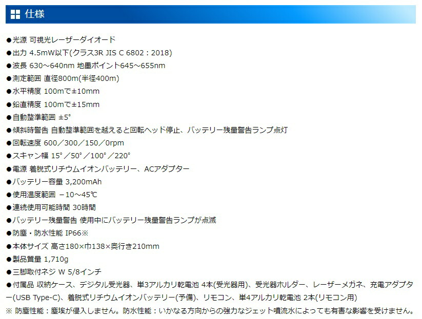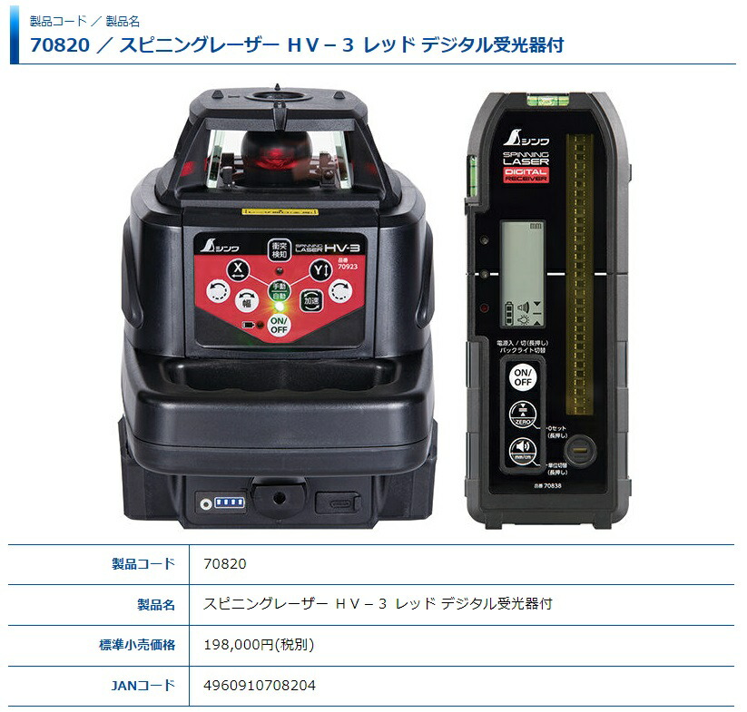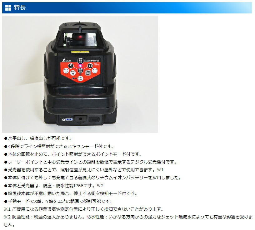 シンワレーザー墨出器スピニングレーザー HV-3 レッド デジタル受光器付 70820保証書は発送時、当店名を記入しておきますのでご安心ください。商品到着後、必ずユーザー登録してください。■特長・水平出し、鉛直出しが可能です。・4段階でライン幅照射ができるスキャンモード付です。・本体の回転を止めて、ポイント照射ができるポイントモード付です。・レーザーポイントと中心受光ラインとの距離を数値で表示するデジタル受光機付です。・受光器を使用することで、照射位置が見えにくい屋外などで使用できます。※1・本体に付けても外しても充電できる着脱式のリチウムイオンバッテリーを採用しました。・本体と受光器は、防塵・防水性能IP66です。※2・設置後本体が不意に動いた場合、停止する衝突検知モード付です。・手動モードでX軸、Y軸を±5゜の範囲で傾斜可能です。※1 ご使用になる作業環境や測定位置により正しく検知できないことがあります。※2 防塵性能:粉塵の浸入がありません。防水性能:いかなる方向からの強力なジェット噴流水によっても有害な影響を受けません。