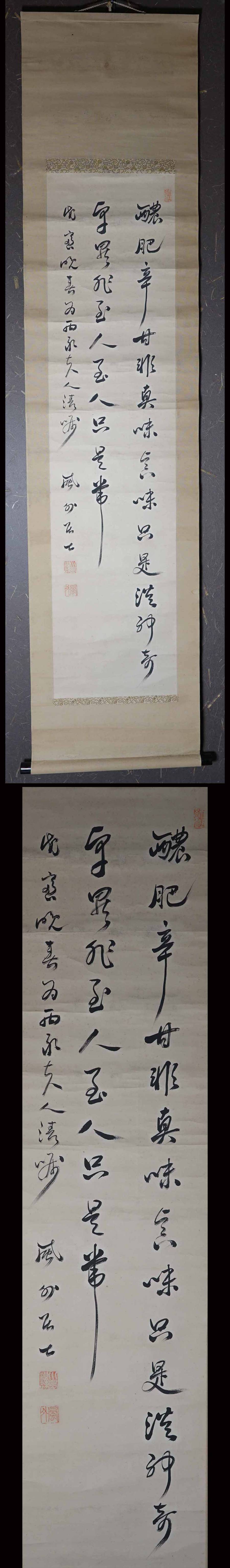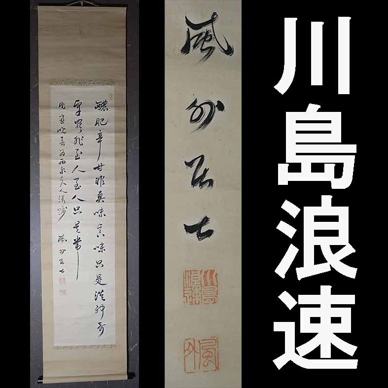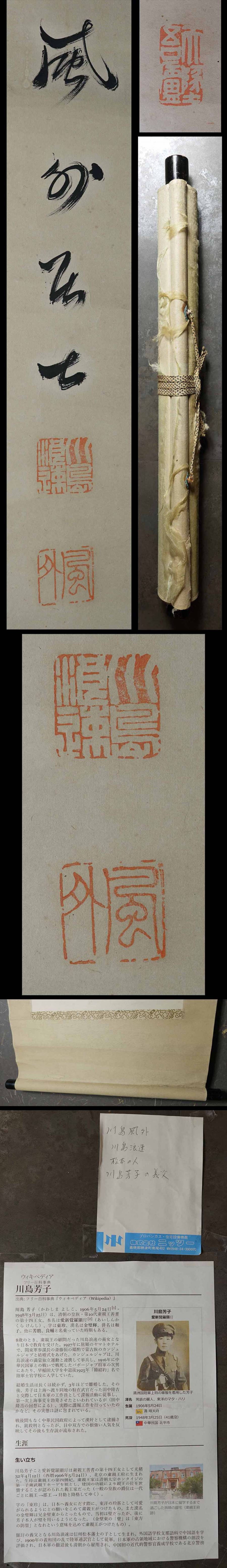 【サイズ】:表具が縦 196cm、横 45cm 本紙が縦 137cm、横 32.5cm 【本紙】:紙本。 【 箱 】:箱なし。 【状態】:本紙に折れ。表具にも折れ染み切れあり。 満蒙独立運動の国士川島浪速! 朝の実力者粛親王と義兄弟となり君に新しいおもちゃを上げようと 娘 第14王女 愛新覚羅 顕シ(のち東洋のマタ・ハリと呼ばれた 男装の麗人川島芳子)を養女としてもらい大陸をまたにかけ暗躍 満州国建国の礎を作ったという傑物。 |