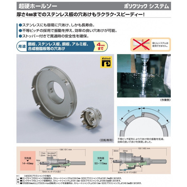 ボッシュ BOSCH超硬ホールソー カッター 回転専用・ステンレスにも容易に穴あけ、しかも長寿命。・不等ピッチの採用で振動を押え、効率の良い穴あけが可能。・ストッパー付きで貫通時の安全性を確保。不等ピッチ配列により穴あけ時の振動を低減。効率の良い穴あけを実現しました。■用途4mmまでの鋼板、ステンレス板、銅板、アルミ板、合成樹脂板等の穴あけ販売はタイトルの商品です。