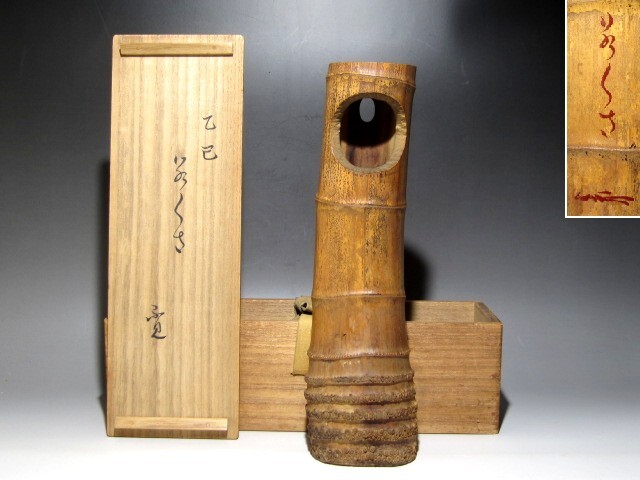 裏千家九世不見斎作の円窓切花入「若草」です。 味わい深い、大変趣のある逸品です。 サイズ 直径8cm/高さ28cm(多少の誤差はお許しください) 状態 一見して疵やヒビ・直しは見られません。 骨董品という事をご勘案頂き、時代経過のスレや、小さな傷がある場合があるかもしれませんのでご承知置きください。 | |||