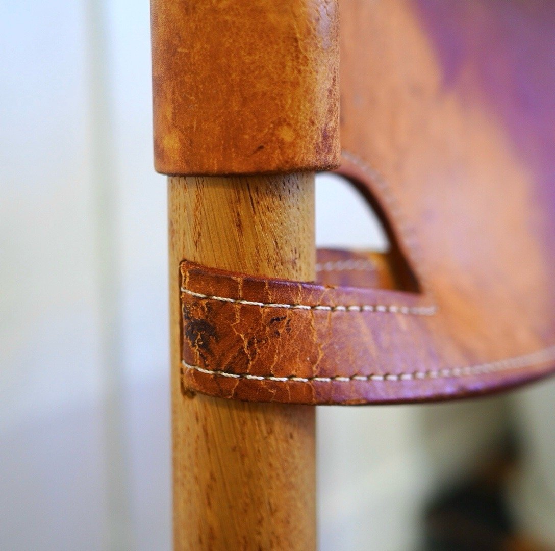 本革なので、長年の使用によりどうしても伸びてきてしまうもの。それも念頭に、革の張り具合を調整できるように座面下のバックルが付いています。